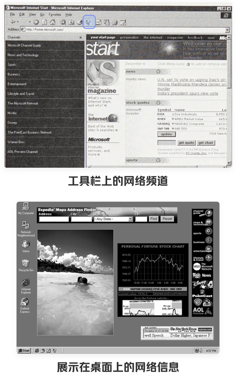 虽然这个想法挺先锋,某种程度上甚至可以算是今天小组件的雏形,但很遗憾因为90年代电脑内存不足、内容提供方少、用户教育不怎么到位等多种原因,这个功能并没有坚持下去。