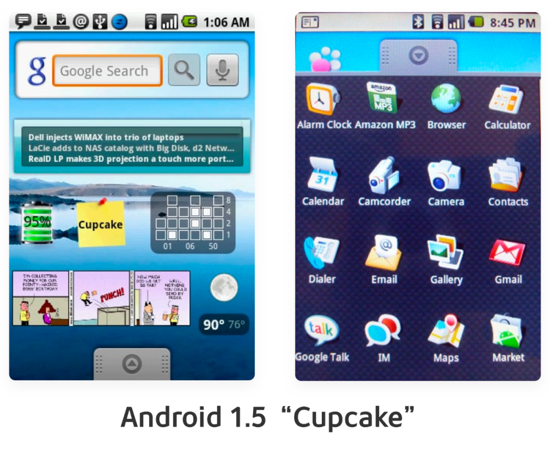 小组件的应用最早可以追溯到安卓1.5版“杯子蛋糕 Cupcake”,在这个版本中,“桌面”和“菜单”是两个平行的独立的空间。用户可以为菜单里的应用“创建桌面上的快捷方式”,也就是“小组件”。可以说这个版本的小组件是非常核心的设计理念。