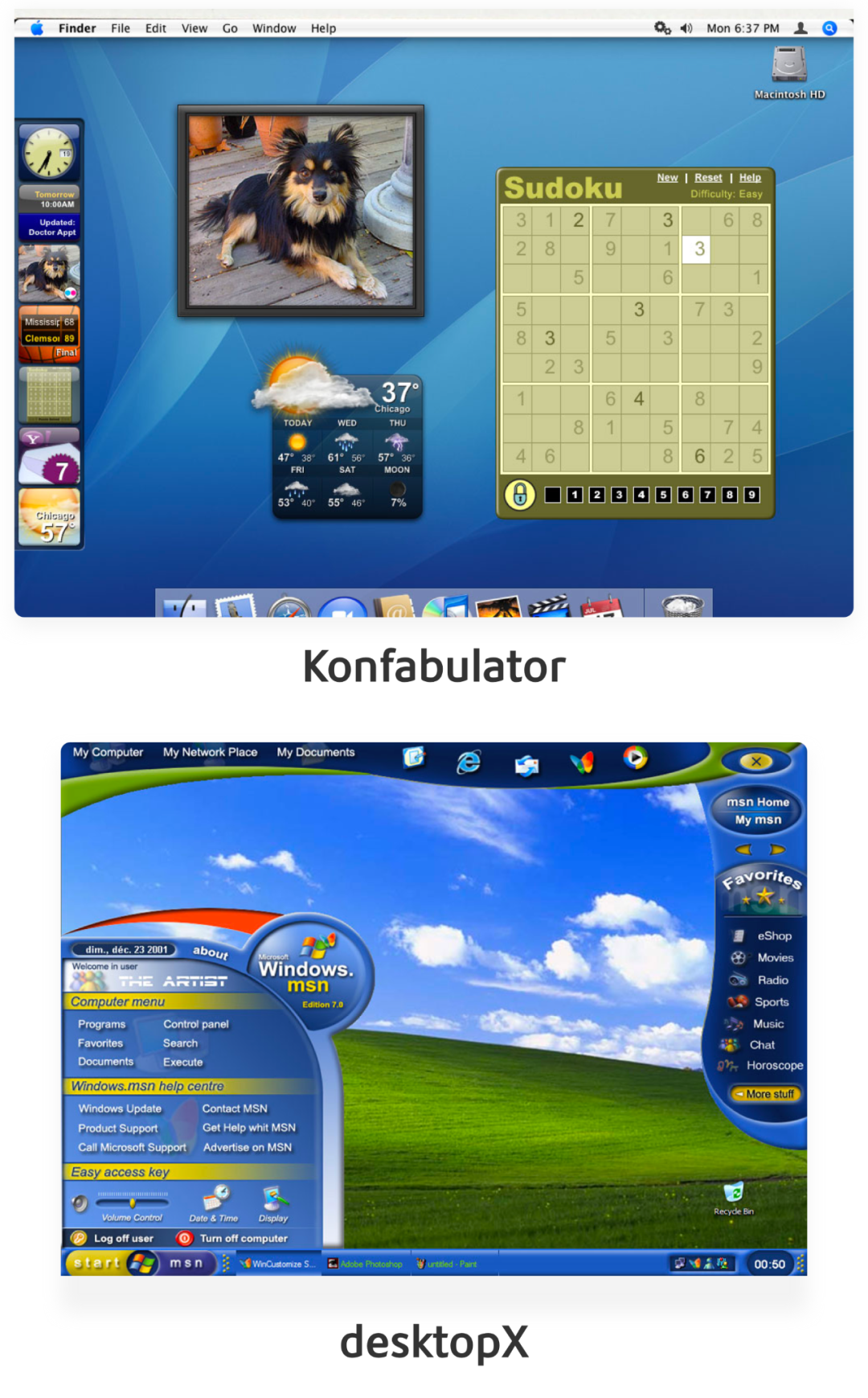 2000年以后,小组件引擎DesktopX/Konfabulator[2][3]等等如雨后春笋般出现在市场上。2003年出现的苹果第三方软件Konfabulator虽然不算是第一个小组件引擎,但被认为是第一个成功商业化的、现象级的小组件产品。当时这款售价25美金的软件能够在你的桌面上放置许多别人制作好的组件,假如你会一些javascript和UI知识,你也能简单的开发自己想要的小组件。
