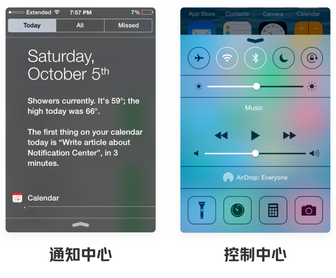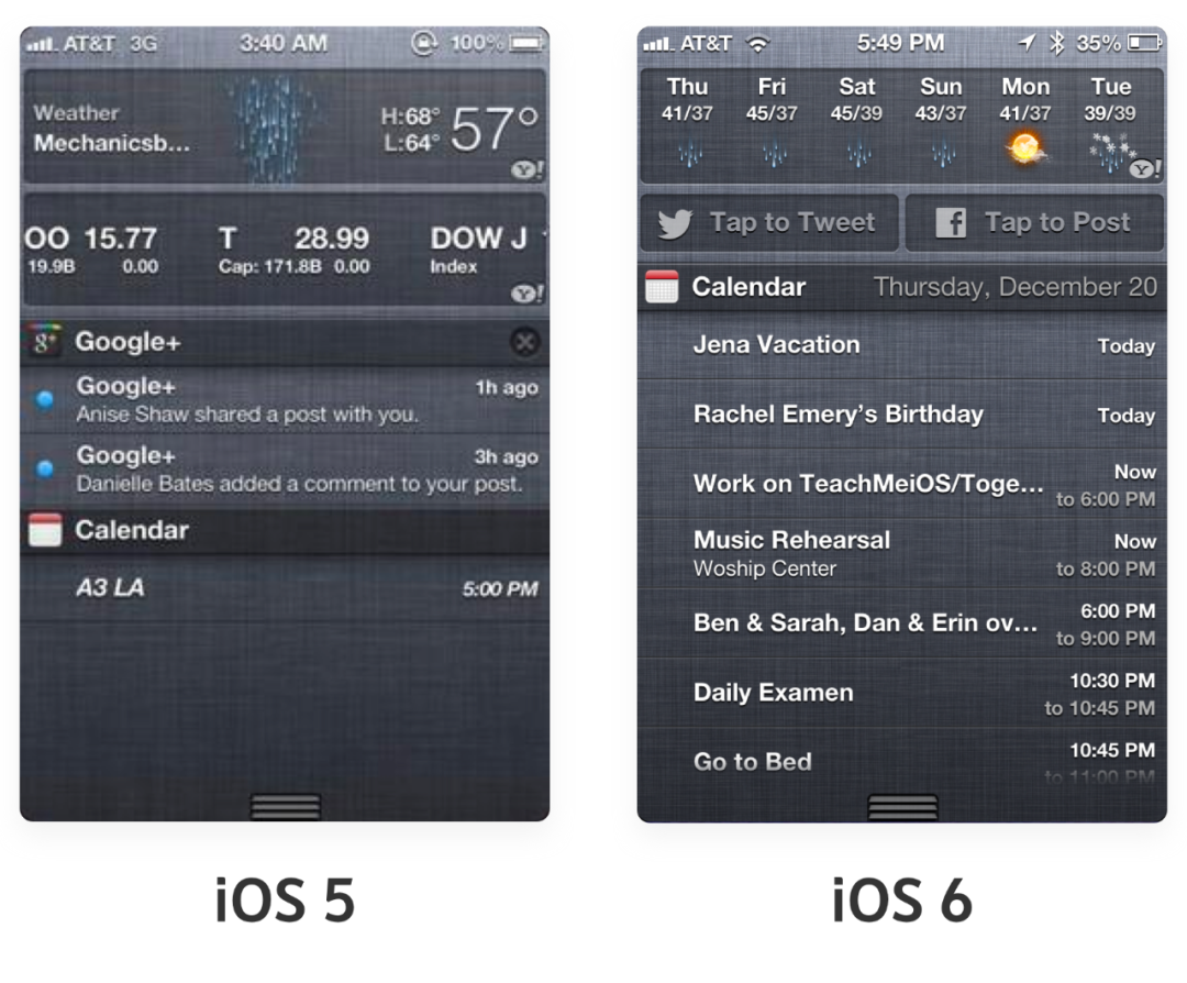 在这个时候,“通知中心”的定位都是很复杂的,它既包含了实时信息的详细展示(比如“5分钟前有个朋友给你发了一条短信”),又包含了用户的高频操作(比如“快速发推”),明显前者的查看频率/场景和后者是不一样的。因此在后续iOS7中,苹果去掉了操作类的小组件在消息中心中的展示,从而使它成为一个纯粹的“信息盒子”。