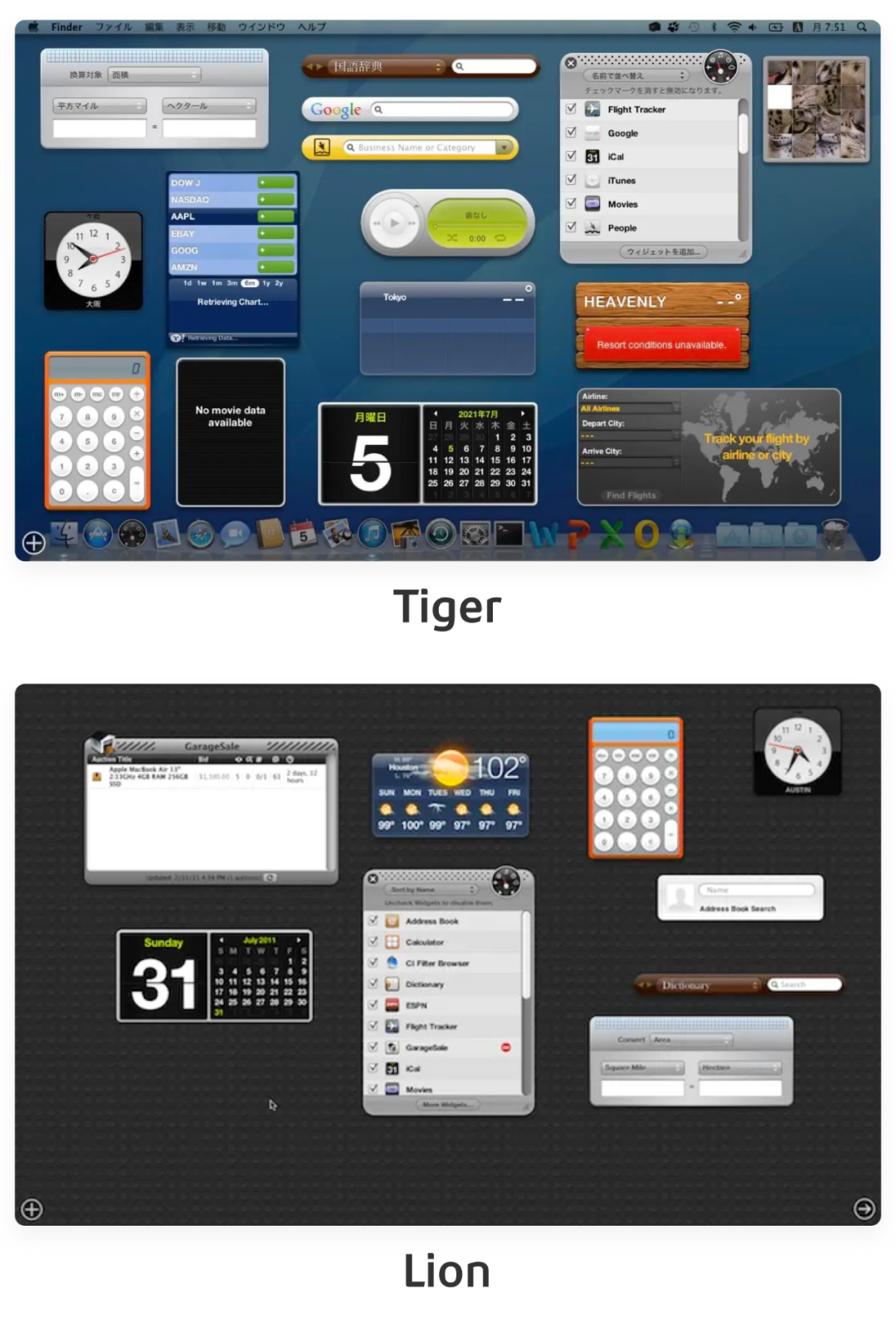 在后来的OS X Lion中,苹果进一步将仪表盘与桌面进行了拆分,仪表盘被放在了一个独立的空间中,你可以通过横滑手势进入这个类似于移动端“负一屏”的空间内,看到你自己下载的小组件。当然后来负一屏这个东西最终还是被取消了,苹果后来采用了类似Windows Vista的设计来承载小组件。