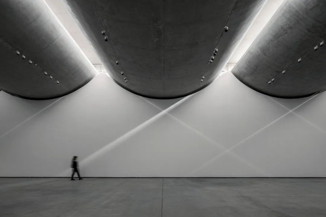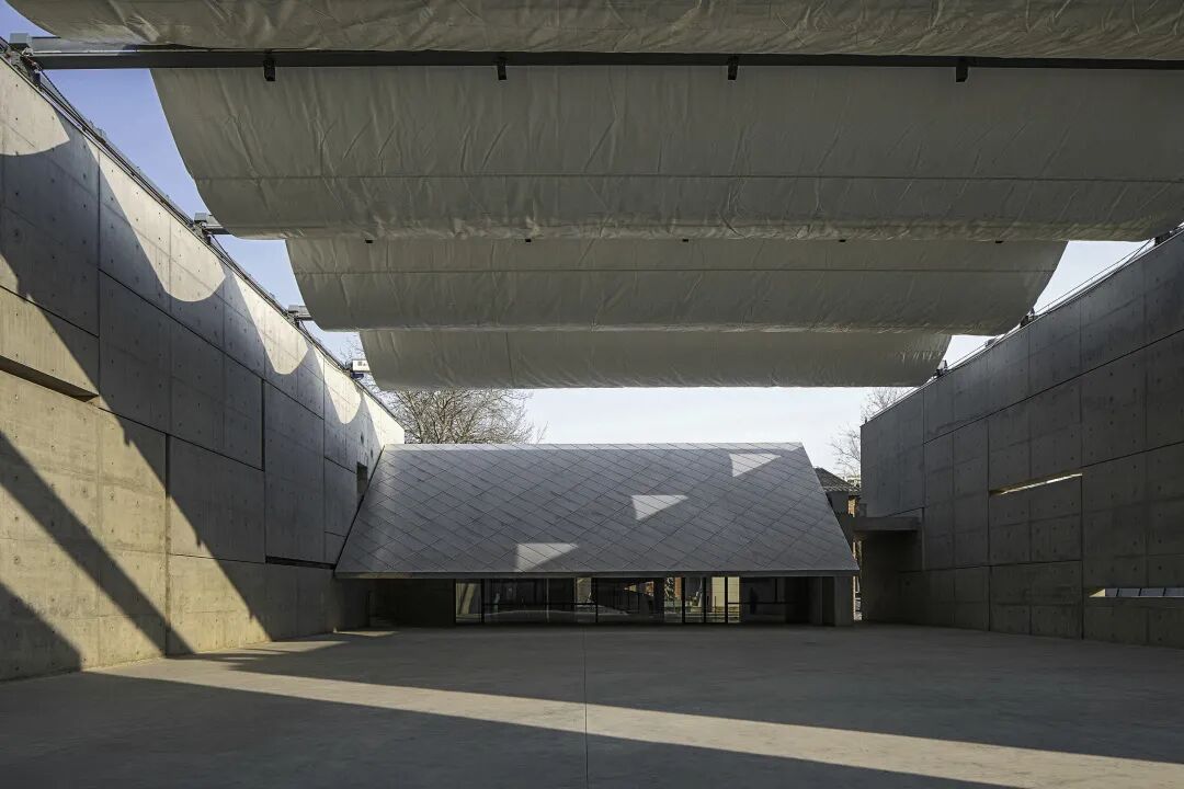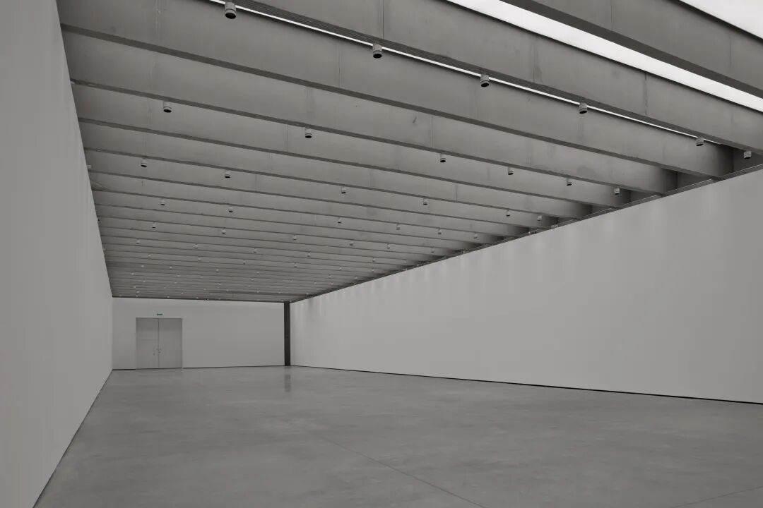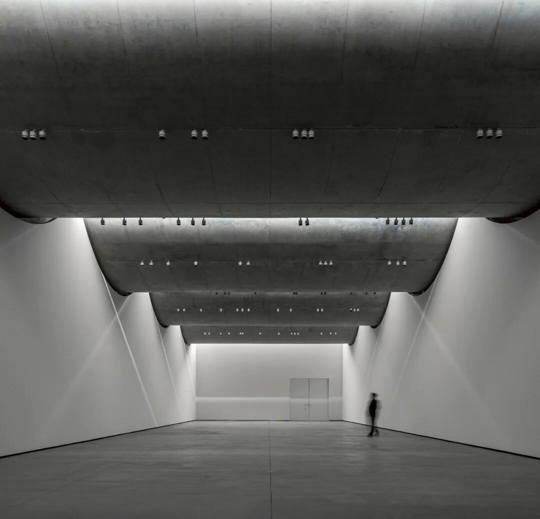 美术馆的设计再次探索了无柱、水平延伸的结构形式和材料的表现力。新建造的两个展厅都采用无柱大跨现浇混凝士结构,一个是采用巨大的倒拱式曲面横梁,伴随着自然天光从比邻的两个拱之间漫射下来,也和中心院落的形似倒拱的帆布的机械装置相呼应。从结构角度上看,倒拱式曲面横梁被两侧的混凝土结构剪力墙体所支撑,展厅内部的白色美术馆墙与倒拱式曲面横梁留有一定宽度的缝隙,可以清晰地表达结构体系和受力关系;另一个是混凝士密肋式大跨橫梁结构体系,密肋横梁薄而高,凸显钢筋混凝土结构和材料特性。