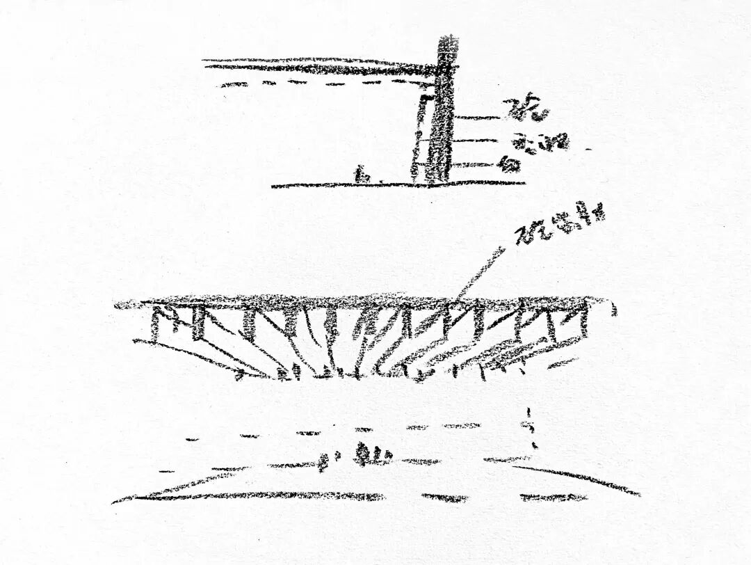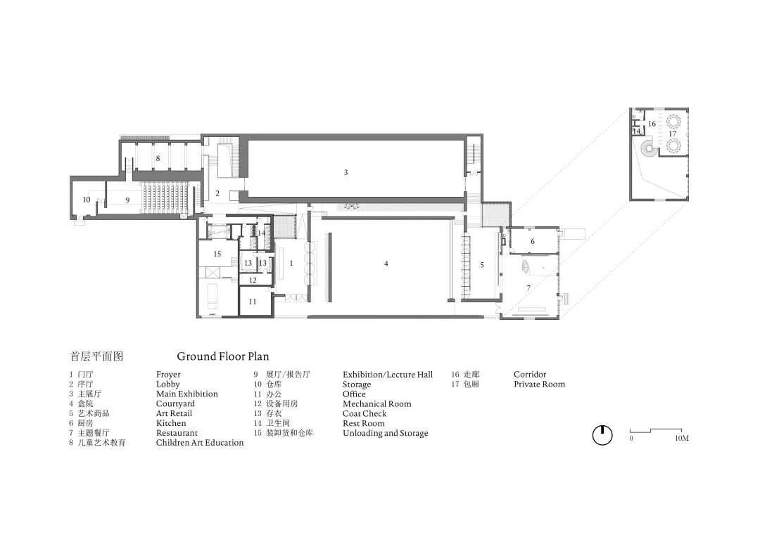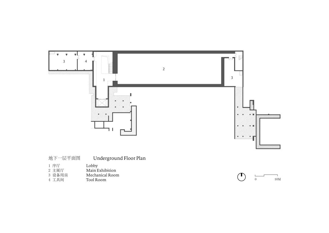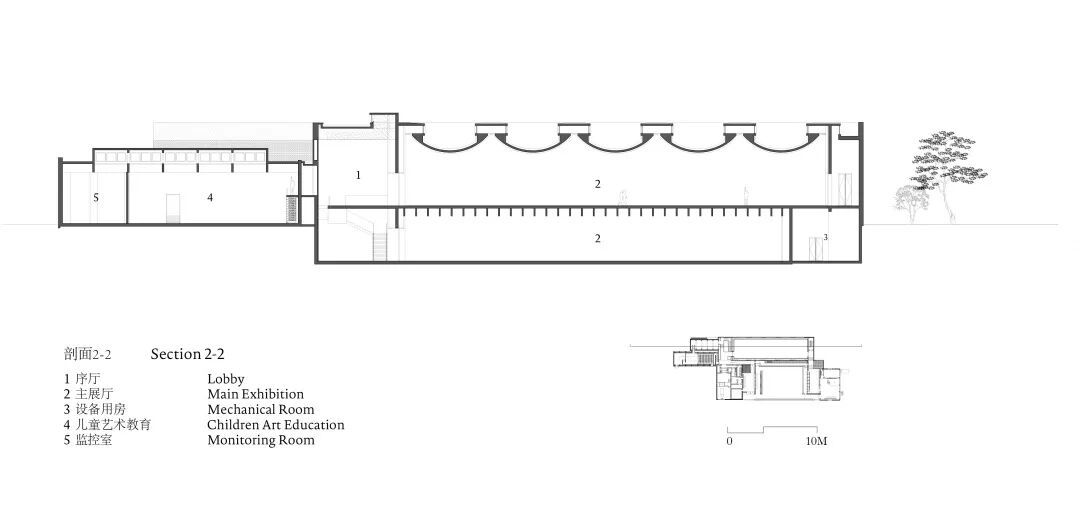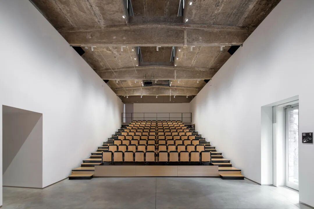 美术馆的设计再次探索了无柱、水平延伸的结构形式和材料的表现力。新建造的两个展厅都采用无柱大跨现浇混凝士结构,一个是采用巨大的倒拱式曲面横梁,伴随着自然天光从比邻的两个拱之间漫射下来,也和中心院落的形似倒拱的帆布的机械装置相呼应。从结构角度上看,倒拱式曲面横梁被两侧的混凝土结构剪力墙体所支撑,展厅内部的白色美术馆墙与倒拱式曲面横梁留有一定宽度的缝隙,可以清晰地表达结构体系和受力关系;另一个是混凝士密肋式大跨橫梁结构体系,密肋横梁薄而高,凸显钢筋混凝土结构和材料特性。