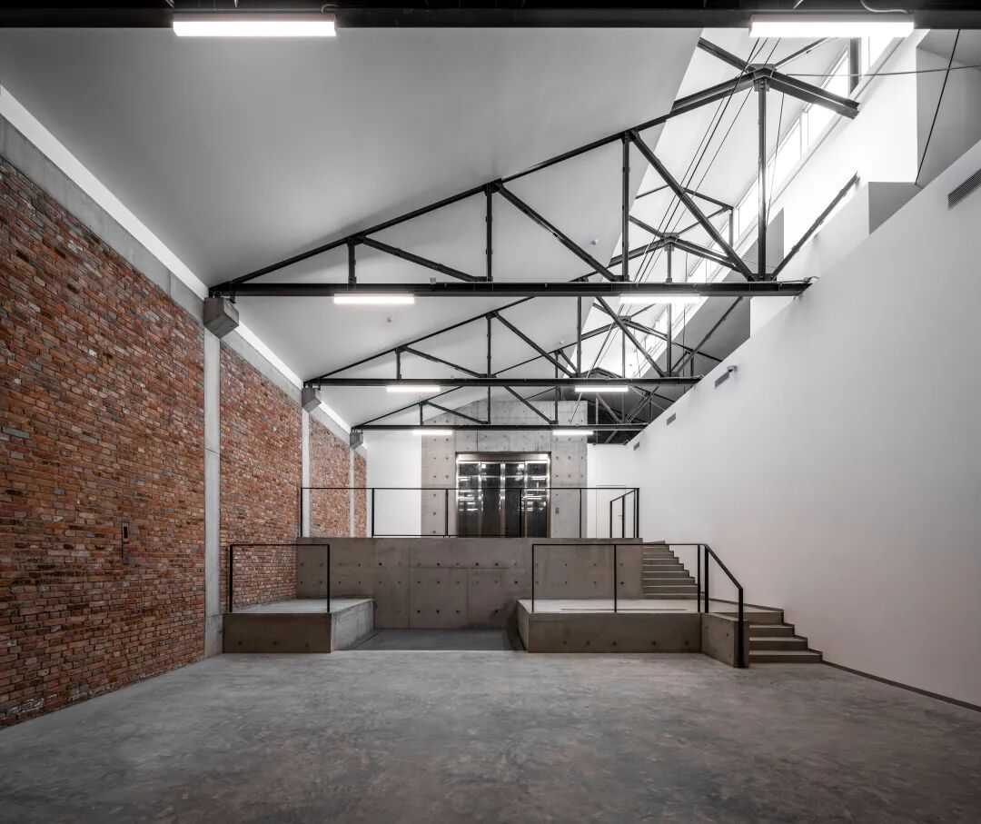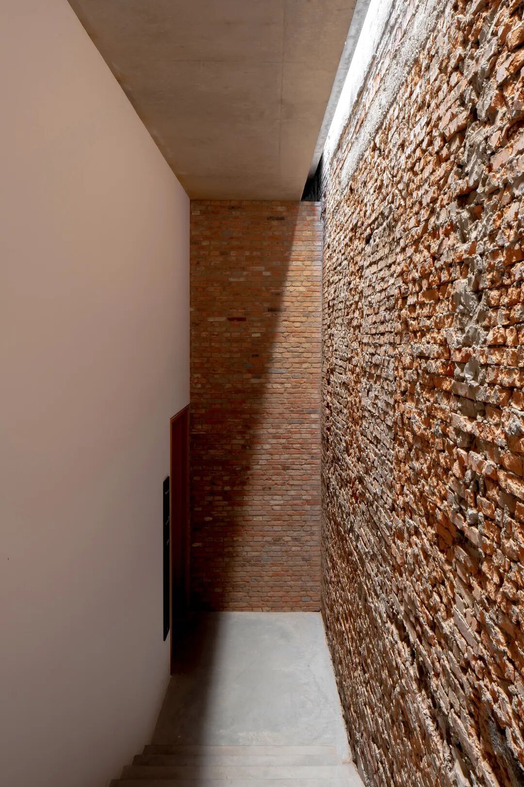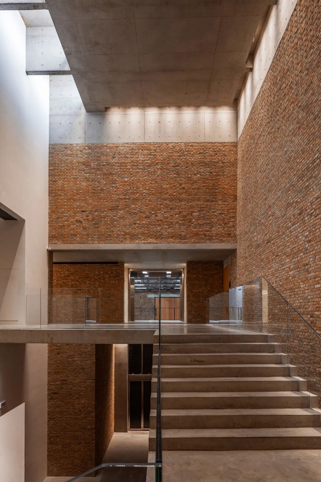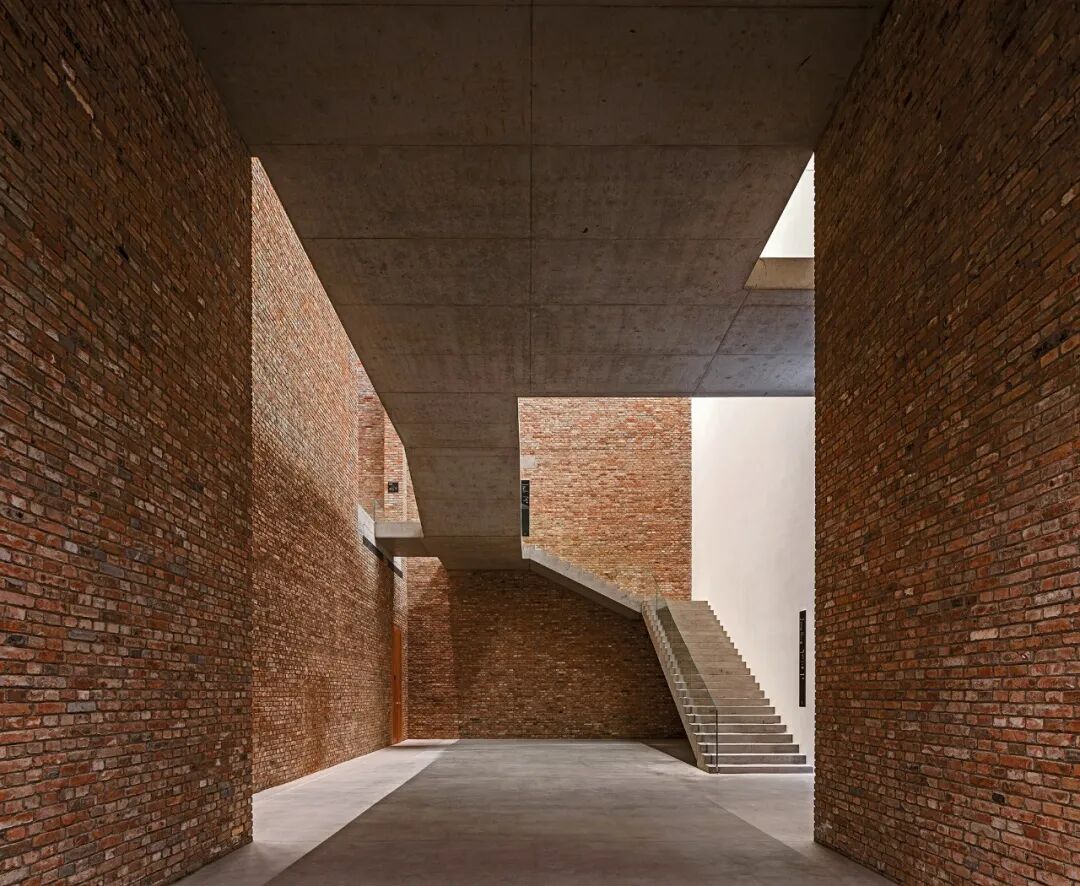 在新建造的两个展厅与老的红砖厂房之间,插入了一个近14米高有着自然天光的垂直竖向的立方柱体空间,东侧是中性的白色墙体,北和西侧是老的红砖砌筑墙体,南侧是宽大透明的客货两用电梯,它近似美术馆内部空间的中枢,连接着位于不同标高的空间。它又像一个光井,直接插在建筑最深、暗的部位。当人们置身于此,可以清晰地感知新旧建筑之间的关系,以及各个空间的标高变化。一个薄薄清水混凝土“天桥”伴随着高低变化的踏步,游离于四面的墙体,蜿蜒螺旋而下,逐渐演变成楼梯,把门厅、上层展厅、报告厅前厅,下层展厅自然的连接在一起。