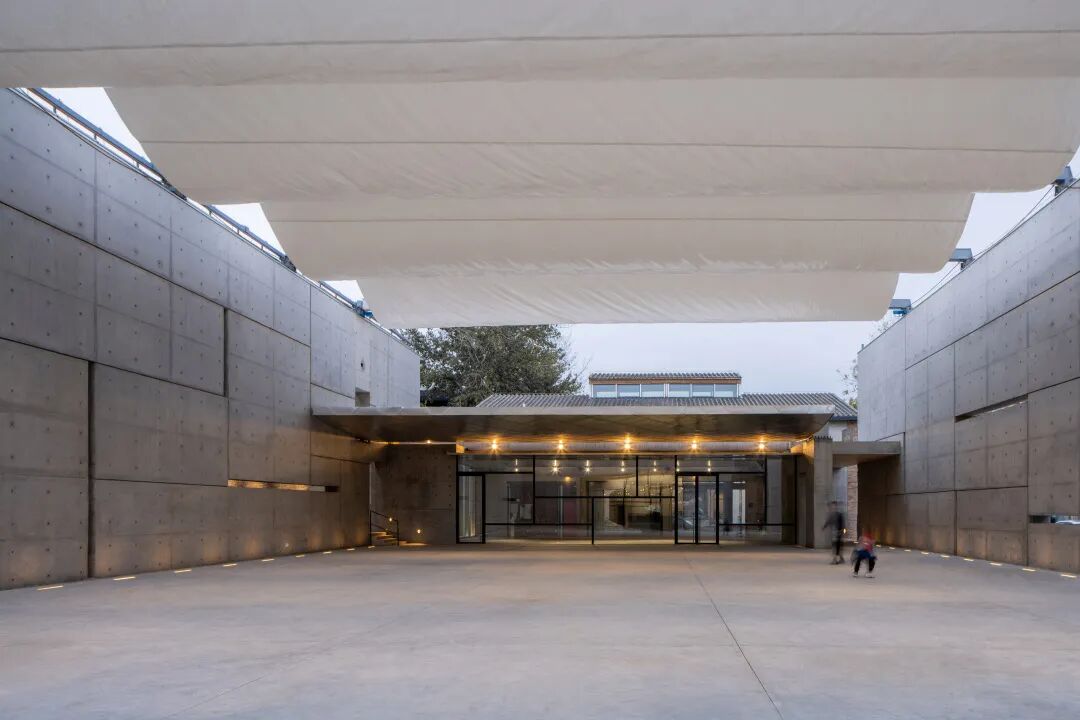 The design of the art museum traces the texture of the original industrial heritage, adopts a series of cubes to shape the order of orthogonal geometric shapes and reflects the construction and planning logic of 798 art district. It is particularly worth mentioning that the magically variable central courtyard transforms the original square surrounded by the three sides of industrial plants into a relatively closed central courtyard with the help of an independent cast-in-situ concrete wall. The huge steel beam sliding crane spans the concrete walls from north to south. It can not only hang art installations, but also a mechanical traction device, which opens canvas with natural drooping, approximately inverted arch and variable shapes one by one. According to the weather and sunshine angle, this inverted arch canvas can be opened and closed at will for shading and rain protection. It is a place where people gather, a venue for the opening ceremony and an outdoor exhibition.