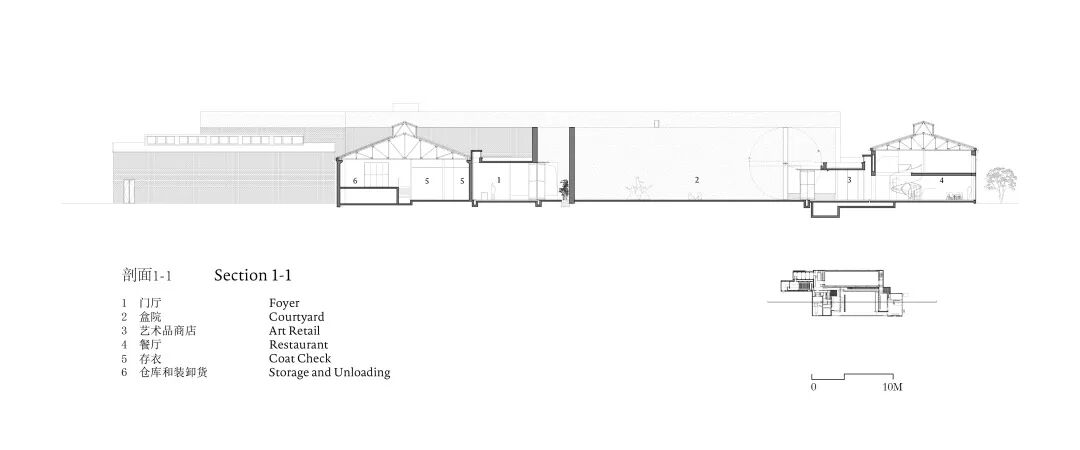 美术馆的设计遵循原有工业遗产的肌理,采用一系列的“盒子”空间,塑造正交几何形体的秩序,一方面,这些盒子空间严格地按照原有老厂房建筑的基础和轮廓,另一方面,也映射798 地区工业厂房平铺直叙的规划思想与朴素的建造逻辑。特别值得一提的是有着魔术般可变的中心院落,它的轮廓也是按照原有装卸货空场而界定的,南侧是借助一道独立的现浇混凝土高墙,将佩斯美术馆西侧的广场区隔开了,在强化了自身内向的领域感的同时,也将原有的、被厂房三面围合的装卸货空场转换成相对封闭的中心院落,巨大的钢梁式滑动吊车横跨在南北的混凝土墙上,它不仅可以悬挂艺术装置,也是张拉一个个自然下垂、近似反拱、形态可变的帆布的机械牵引装置。根据天气、阳光角度,这些反拱形态的帆布可以任意开合,遮阳避雨。独立混凝土墙体上藏有可以水平移动的大门,以利于超大艺术装置的运输到院落中。中心院落是人流聚集的场所、开幕式的场地、也是户外展场。