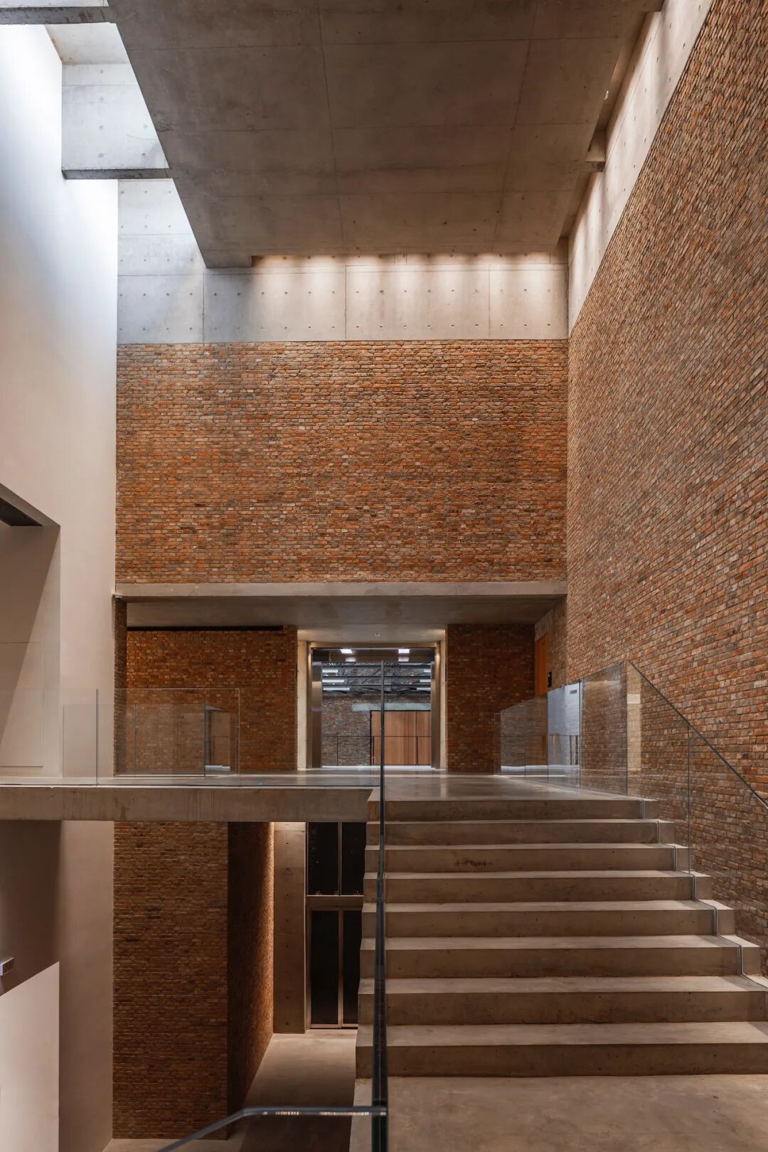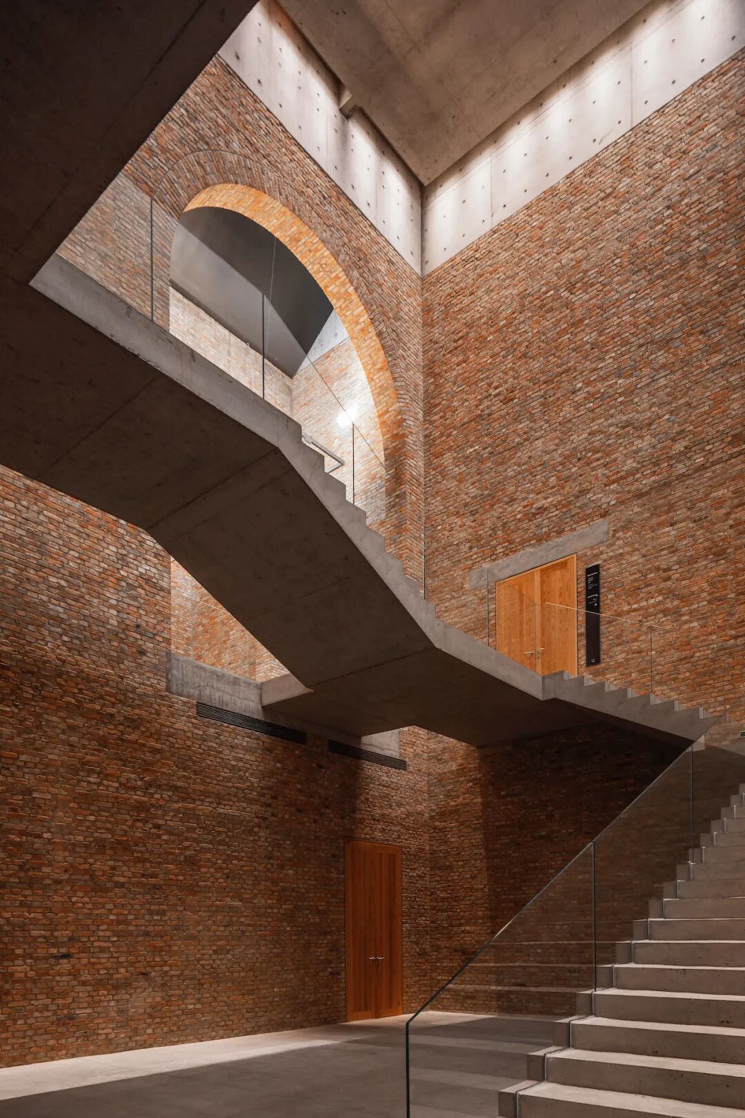 在新建造的两个展厅与老的红砖厂房之间,插入了一个近14米高有着自然天光的垂直竖向的立方柱体空间,东侧是中性的白色墙体,北和西侧是老的红砖砌筑墙体,南侧是宽大透明的客货两用电梯,它近似美术馆内部空间的中枢,连接着位于不同标高的空间。它又像一个光井,直接插在建筑最深、暗的部位。一个薄薄的清水混凝土“天桥”在不同高度之间,把门厅、上层展厅、报告厅前厅,下层展厅连接在一起。