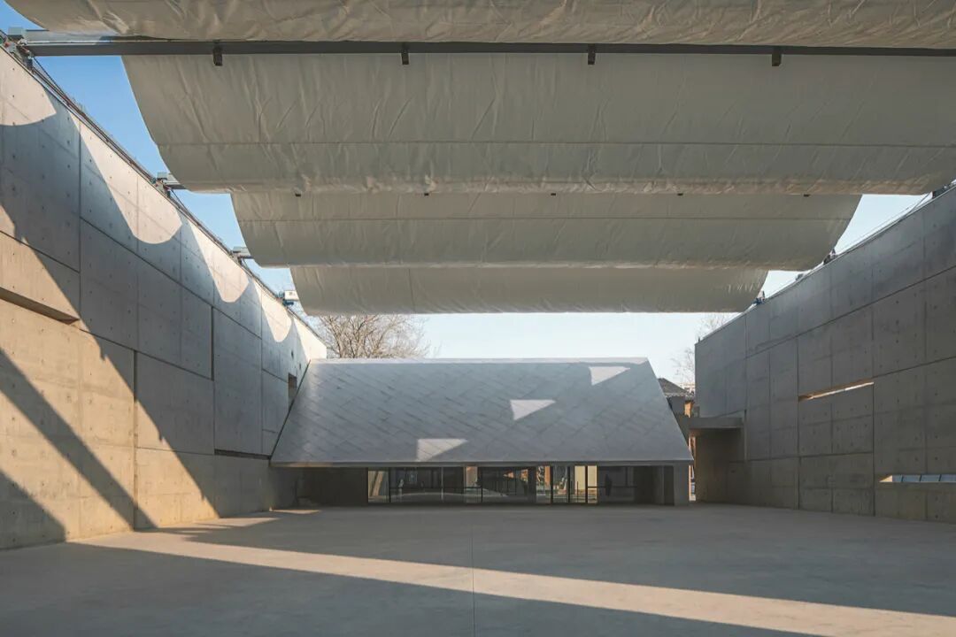 中心院落的轮廓也是按照原有装卸货空场而界定的,南侧是借助一道独立的现浇混凝土高墙,将佩斯美术馆西侧的广场区隔开了,将原有的、被厂房三面围合的装卸货空场转换成相对封闭的中心院落,巨大的钢梁式滑动吊车横跨在南北的混凝土墙上,它不仅可以悬挂艺术装置,也是张拉一个个自然下垂、近似反拱、形态可变的帆布的机械牵引装置。根据天气、阳光角度,这些反拱形态的帆布可以任意开合,遮阳避雨。独立混凝土墙体上藏有可以水平移动的大门,以利于超大艺术装置的运输到院落中。