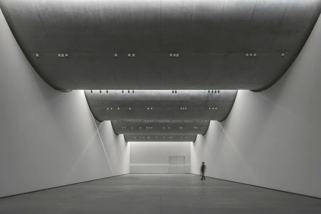 新建造的两个展厅都采用无柱大跨现浇混凝士结构,一个是采用巨大的倒拱式曲面横梁,自然天光从比邻的两个拱之间漫射下来,也和中心院落的形似倒拱的帆布的机械装置相呼应。