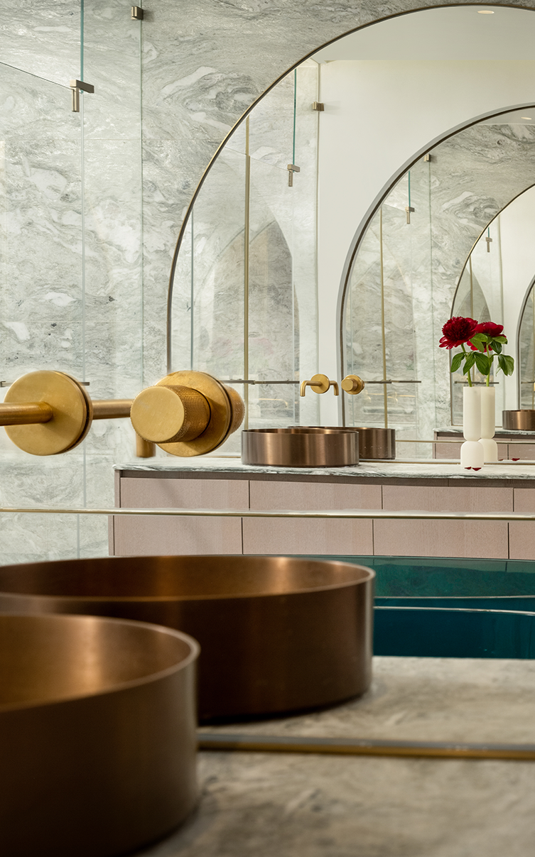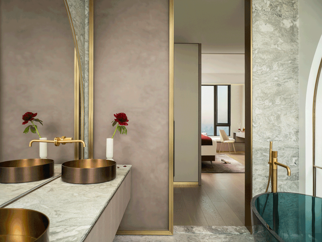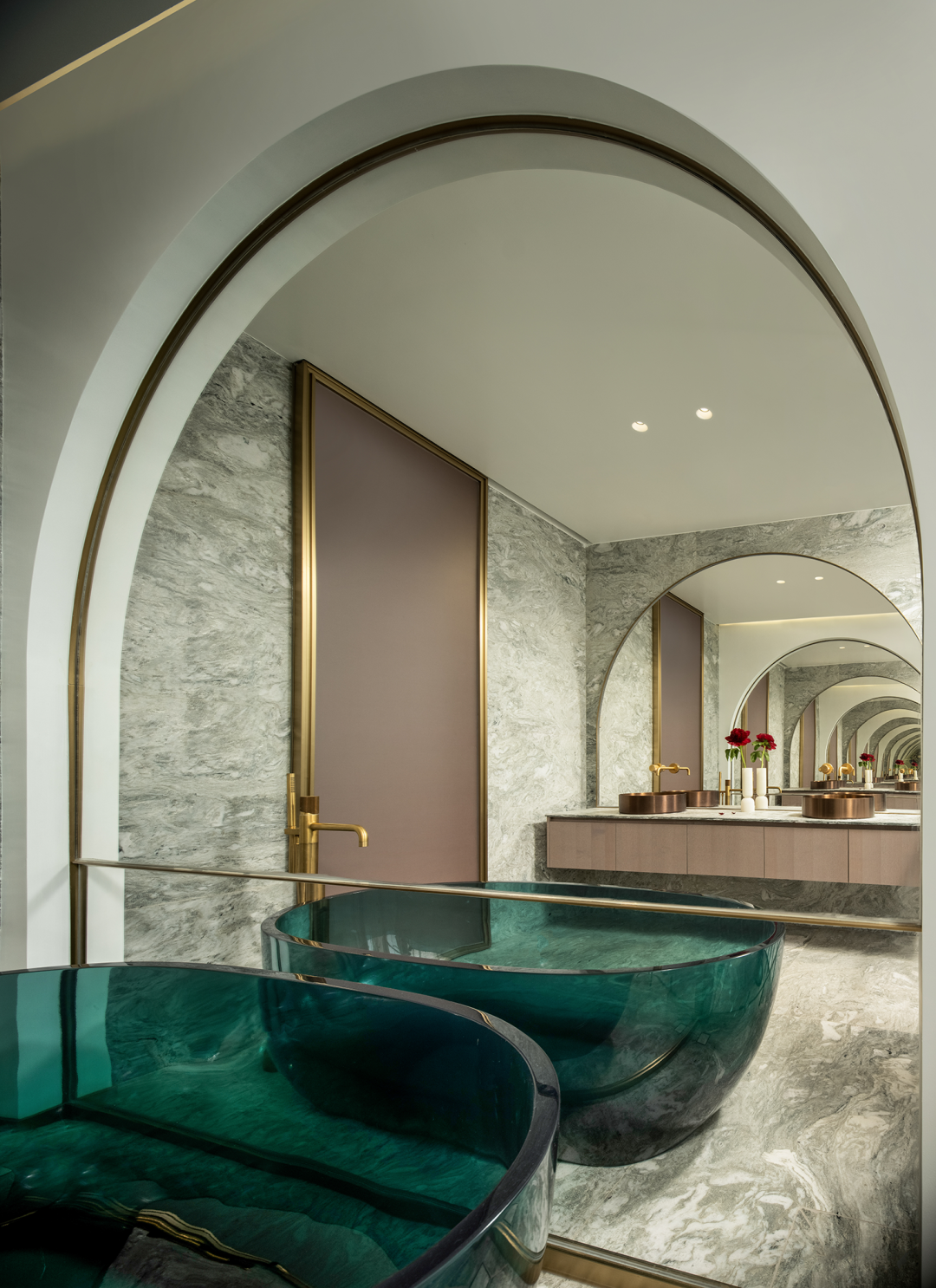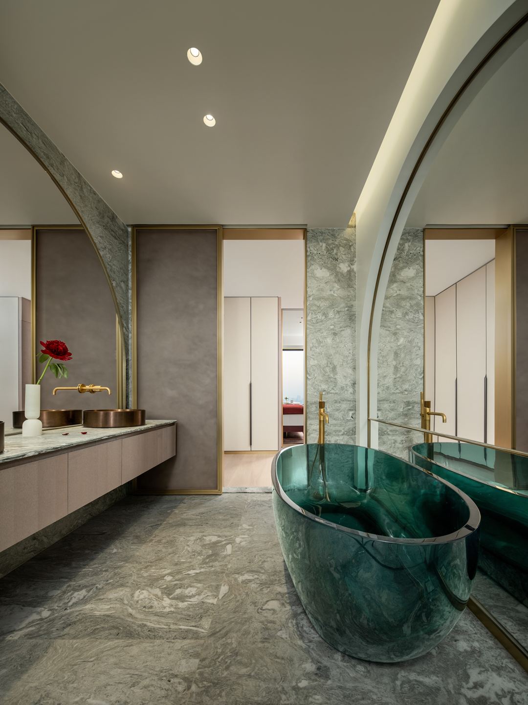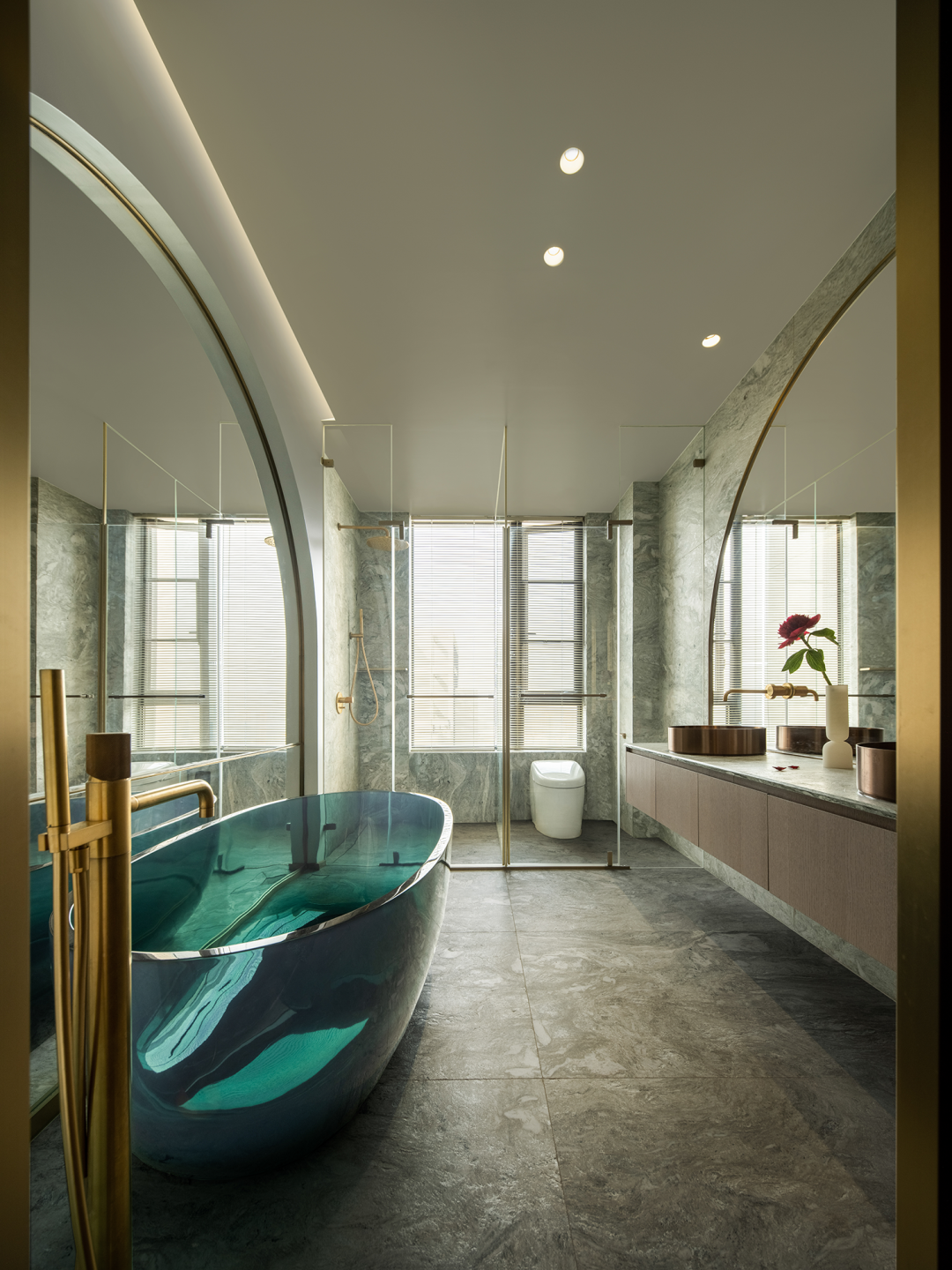大面积绿色石材铺陈出水纹流动的效果,宝石般的透明的浴缸,让室内更为通透,与窗外的江景构成内在呼应。