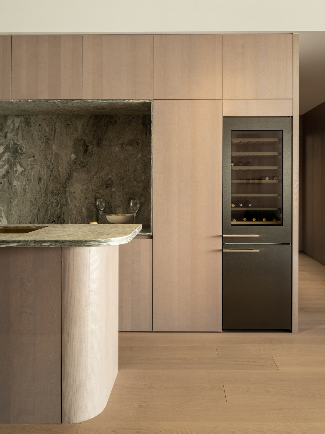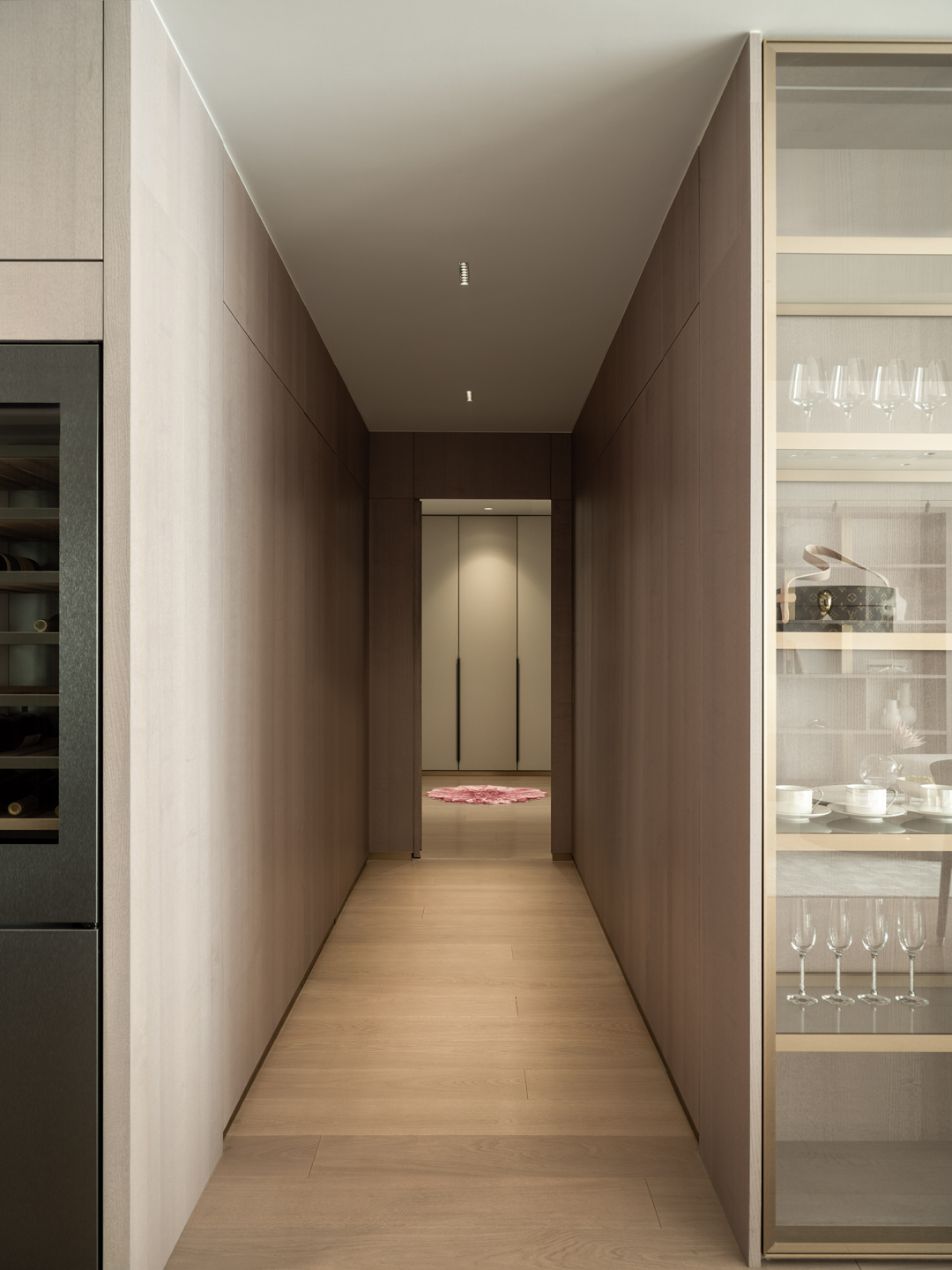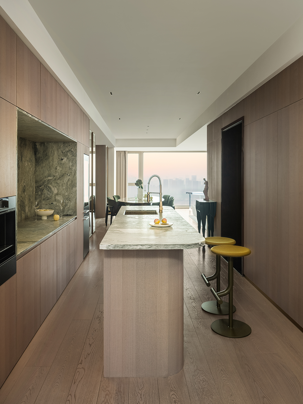 吧台处于全家连接的枢纽位置,无论是归家伊始的稍事休整,还是早午餐、下午茶时间,这里都构成了一个极为舒适便捷的生活驿站。