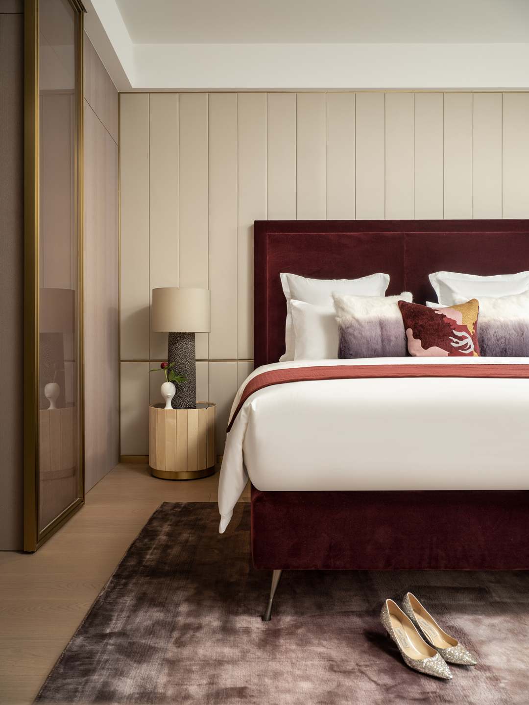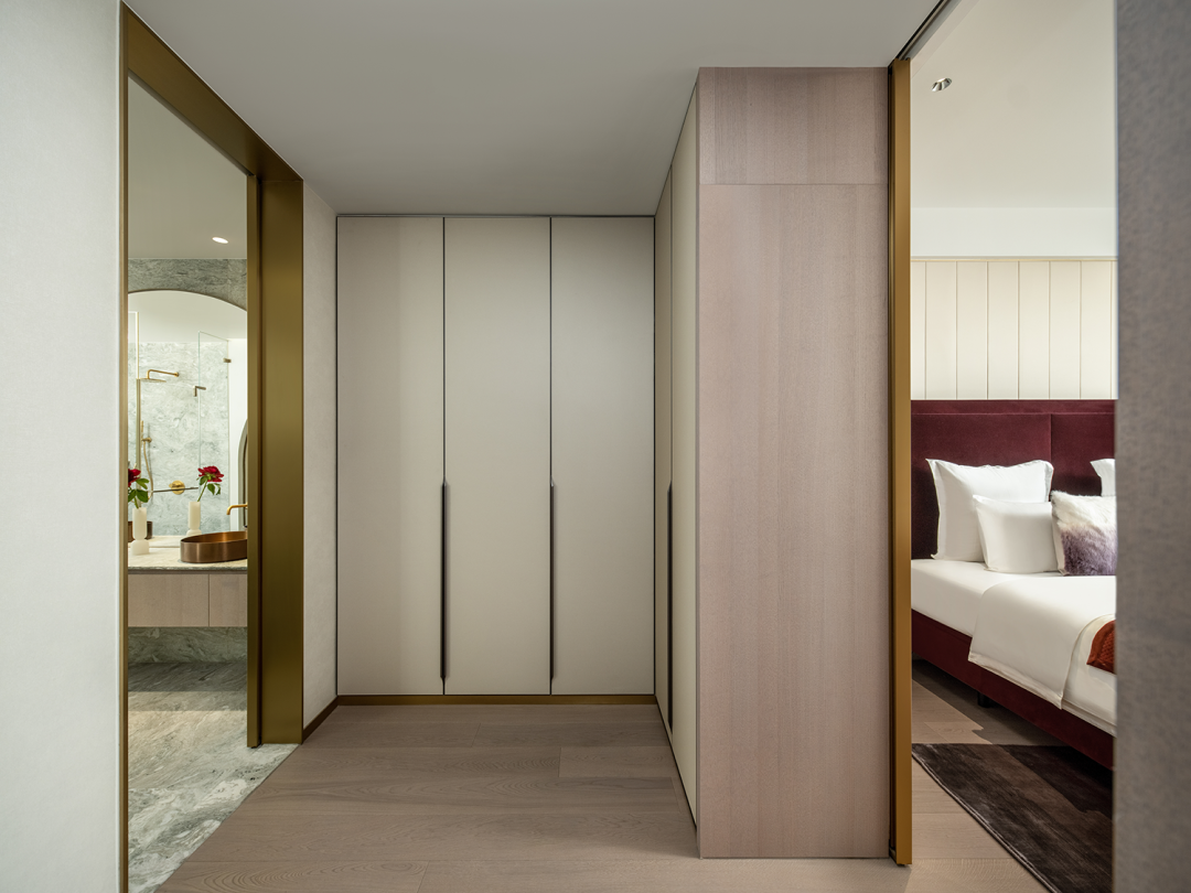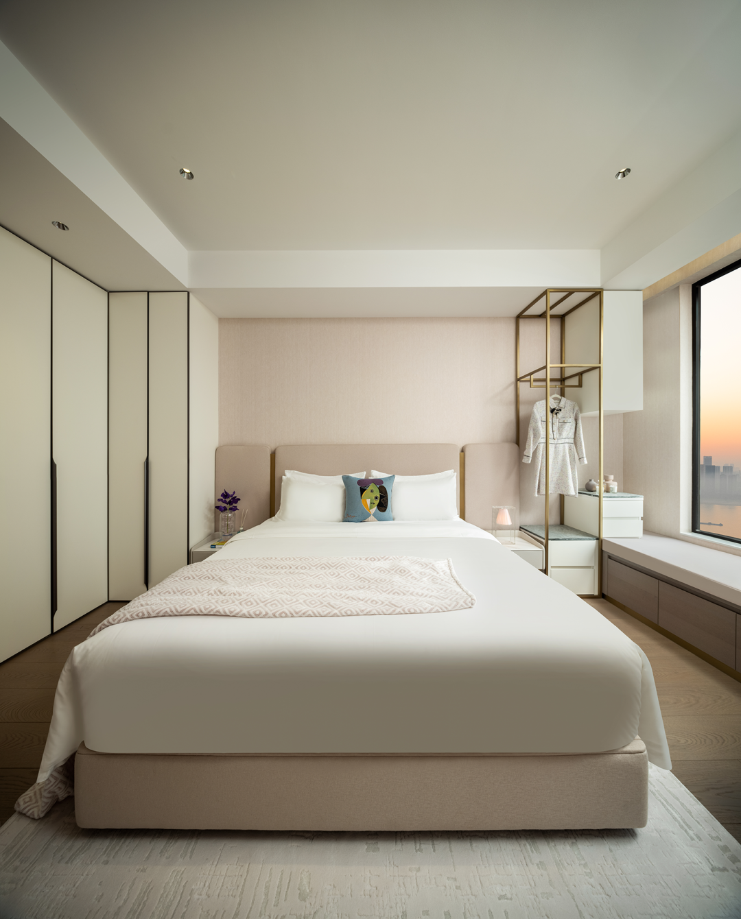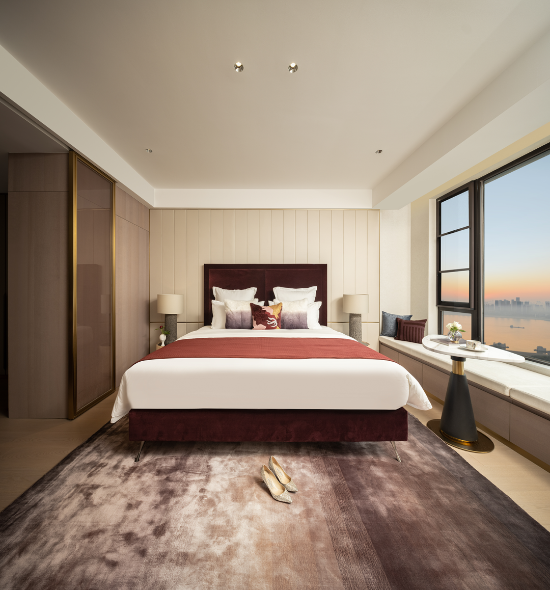 所有卧房都是南向望江,兼备自在与优雅的豪宅气质。女儿房以不同的粉色材质构成了一组组墙纸、布艺的层次晕染,再由金属勾边、收口,凸显极致工艺。