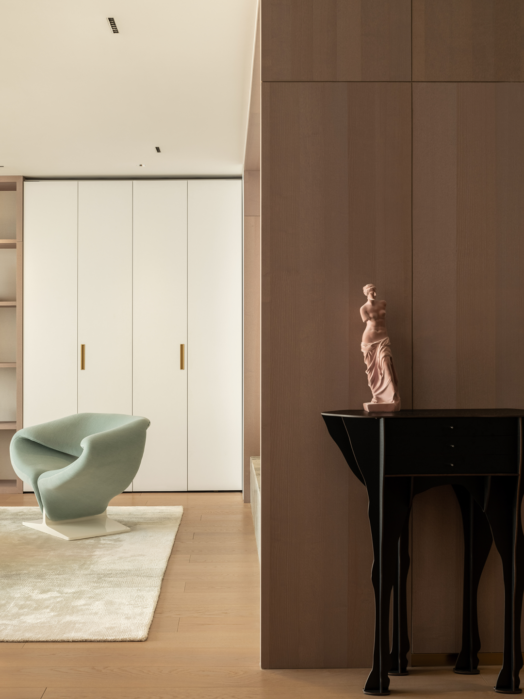 “私宅不是样板间,空间感没有调整好的话,后期用再好的艺术品,再好的家具都没有意义的,第一步就是让空间有豪宅感,”设计师说。