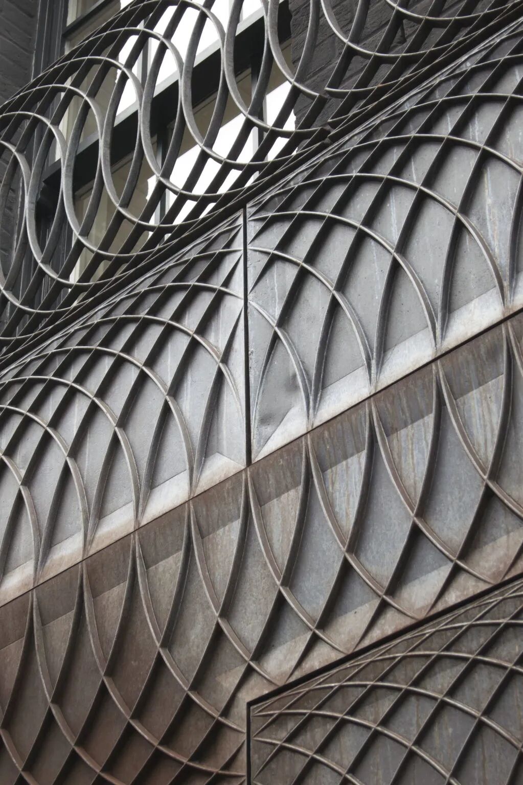 6a建筑事务所设计的这一位于梅菲尔的铸铁立面,上面复杂图案和褶皱让人想起了设计师品牌Paul Smith的精细纺织工艺。立面由互锁的椭圆形层组成,最终形成一楼上方类似设计的阳台护栏。