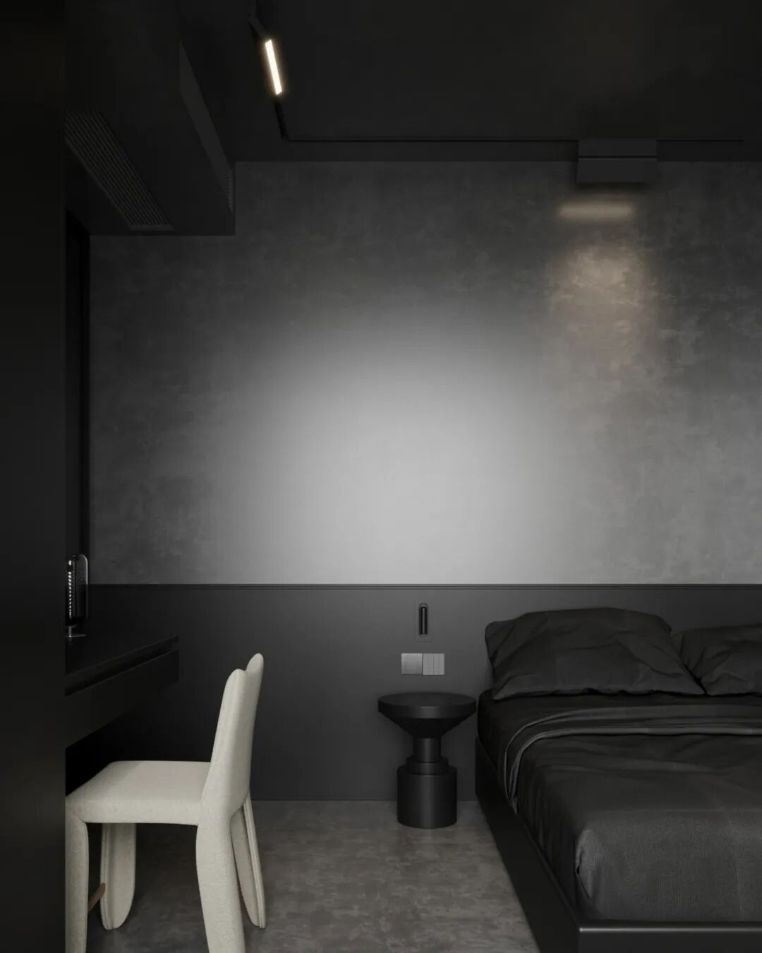 保留一间客房,小阅读灯,搭配悬浮书桌以及一组衣柜。