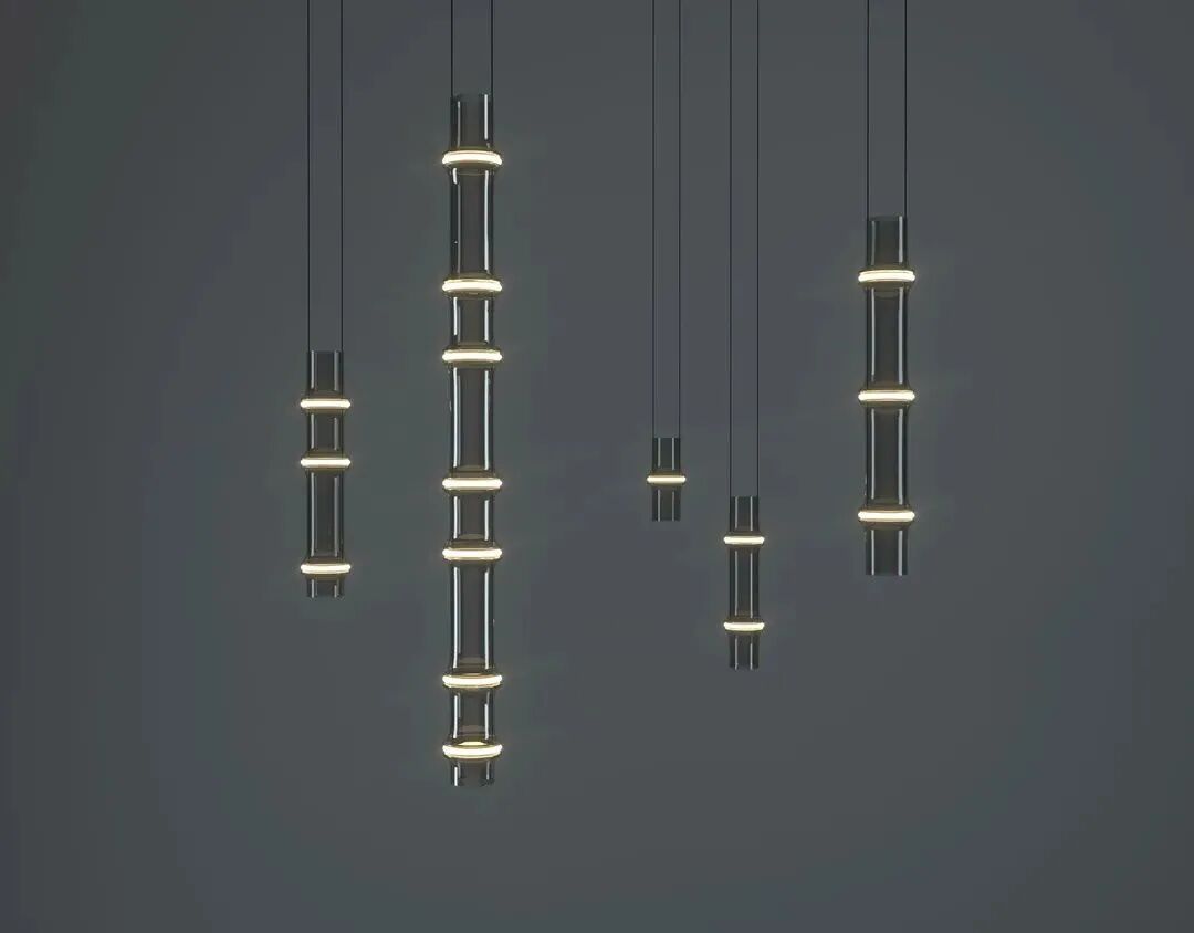 竹节灯由不同的模块组合,犹如自然生长的竹子,长短高低可以有很多的变化,满足不同的空间使用,能够营造出出空灵幽静的环境氛围,有落地灯与悬吊灯两种款式。竹节由纯手工吹灯玻璃制成,灯身剔透空灵一如透明竹节,天然带有恢弘气势。白天时日光明亮,烟灰色透明的竹节形体,为建筑间增添自然风景之美。夜晚串联在竹节之间的环形灯带,散发出如月光一般温煦柔美的光芒,打造一片光之竹林。
