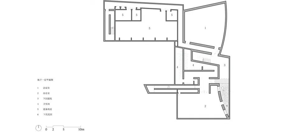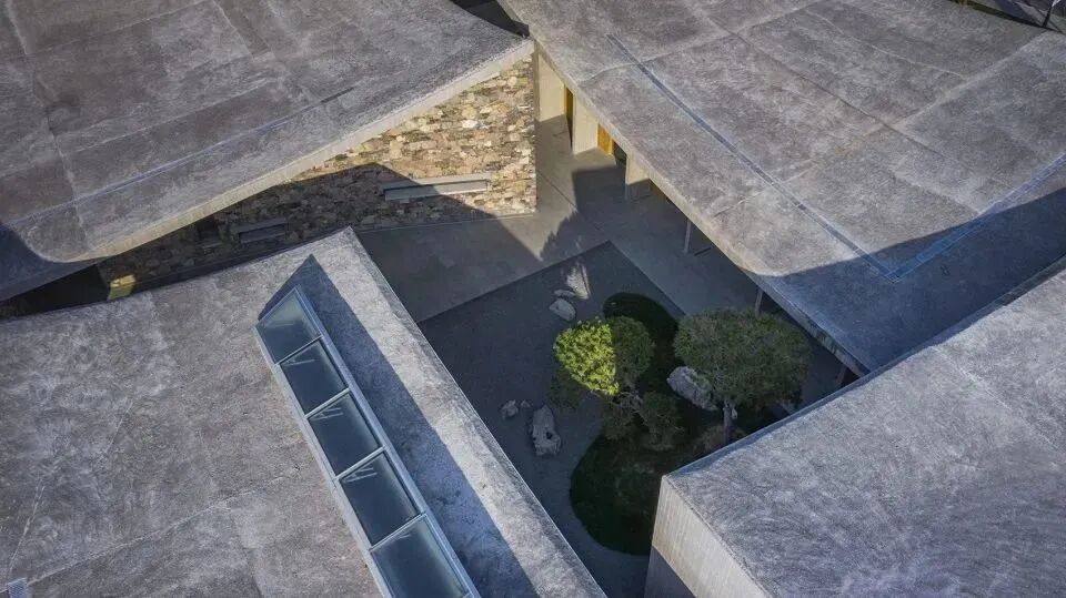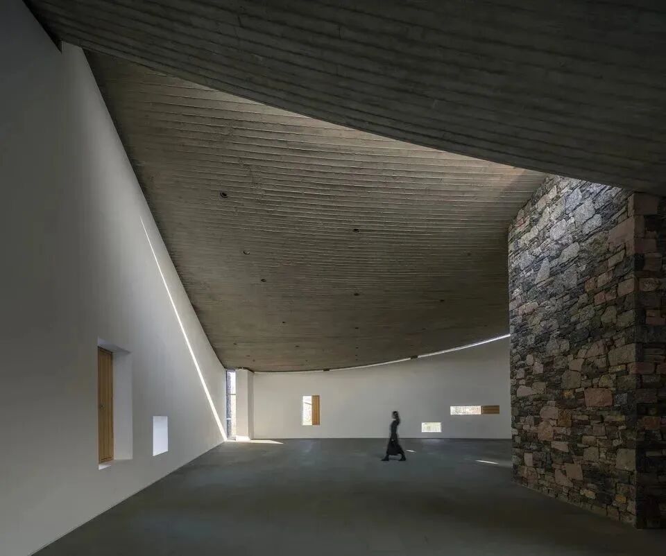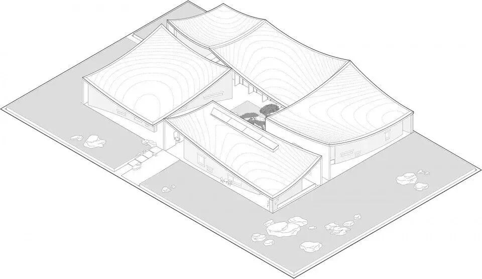 “项目是由4个相对单独的空间,借助起伏剧烈的混凝土双曲面张拉屋顶的拉拽,围合、撞击而成的‘类合院’建筑。一方面,从平面上看,屋顶的几何边界清晰地界定了建筑外轮廓和中心内院的简单矩形边界;另一方面,起伏双曲面屋顶下墙体的折转走向,塑造了檐下不同进深的灰空间,模糊了建筑与中心内院的边界,打破了传统合院建筑对称、均质、秩序的属性, 把古老的原型重新阐释为具有神圣感的当代公共空间。巨大的混凝土双曲面屋顶,因为重力而塑造出的自然下垂曲面,在屋顶和地面之间产生了诗意的张力,塑造了某种紧张感。