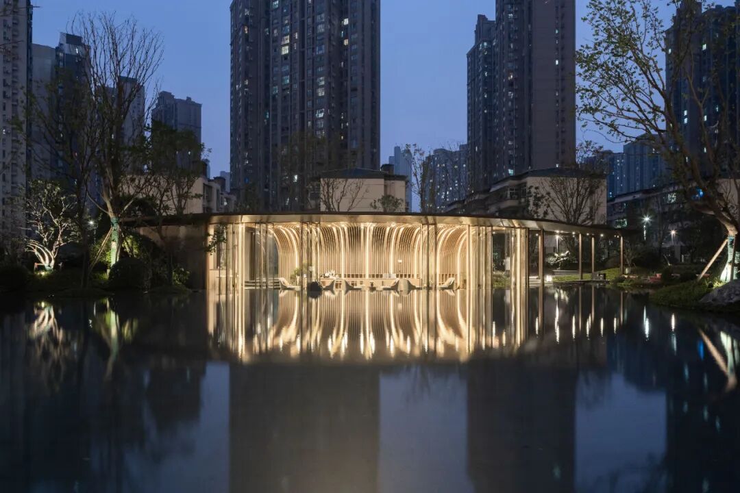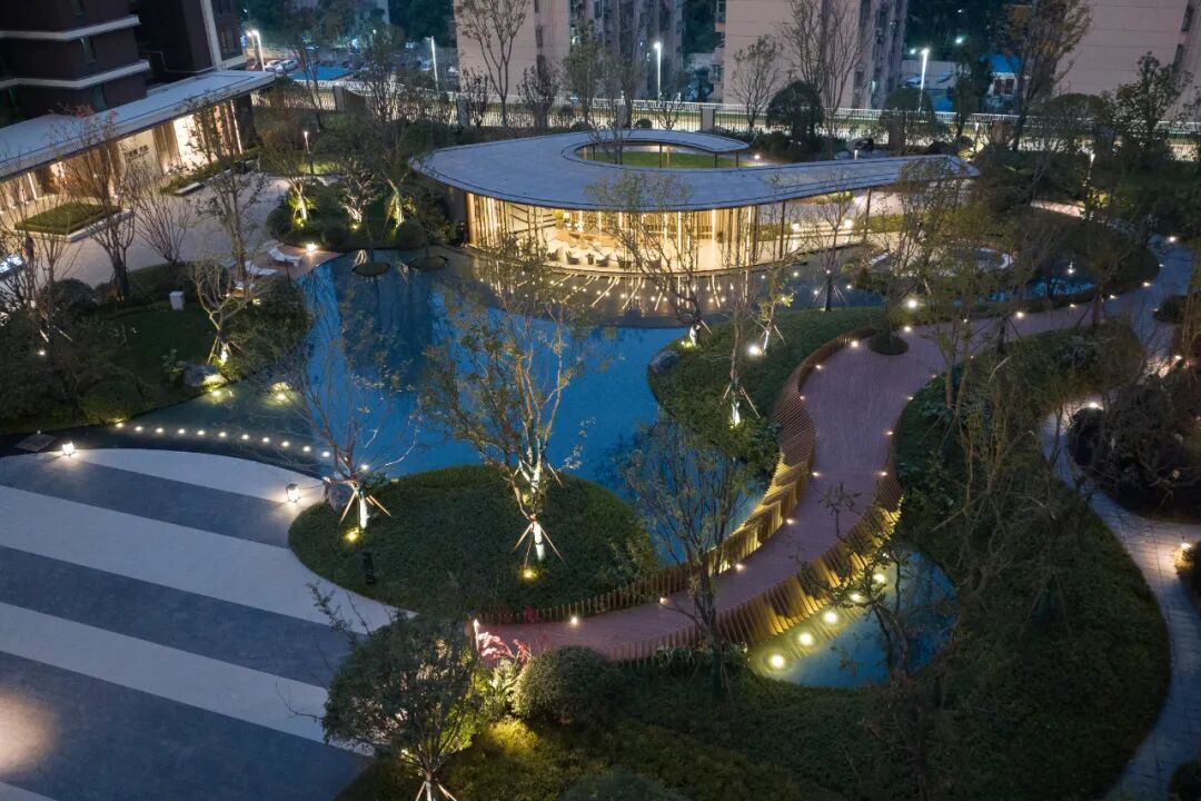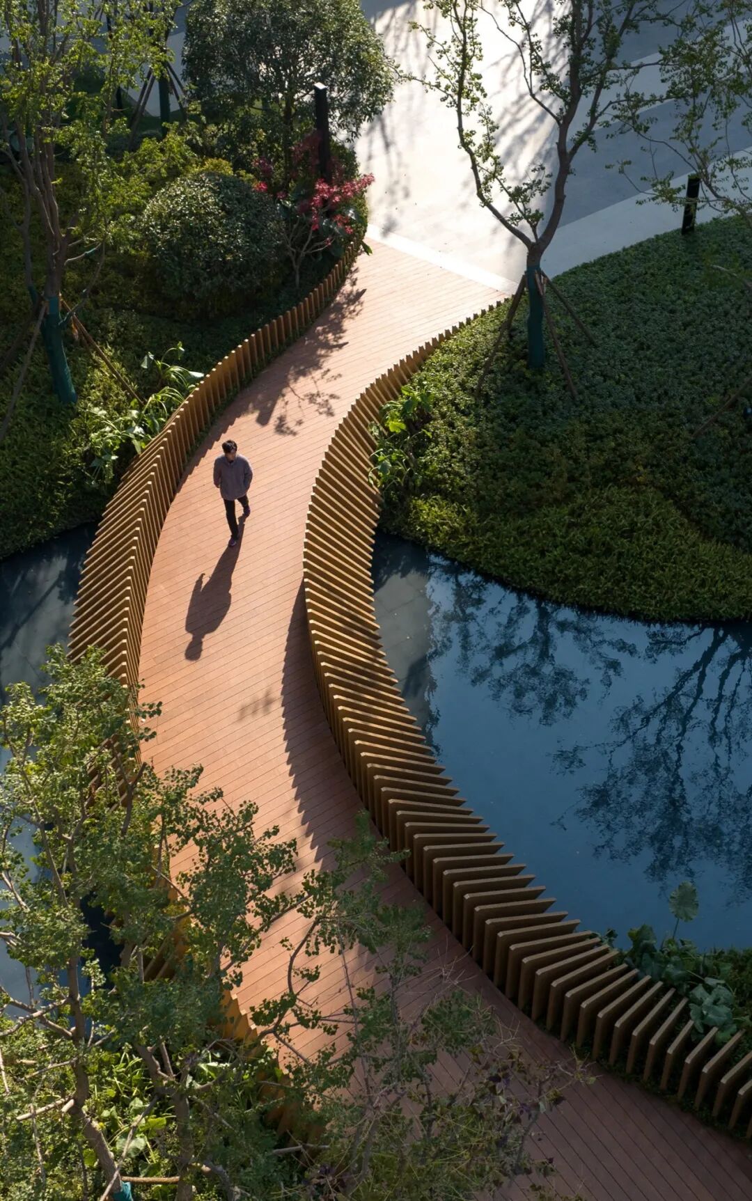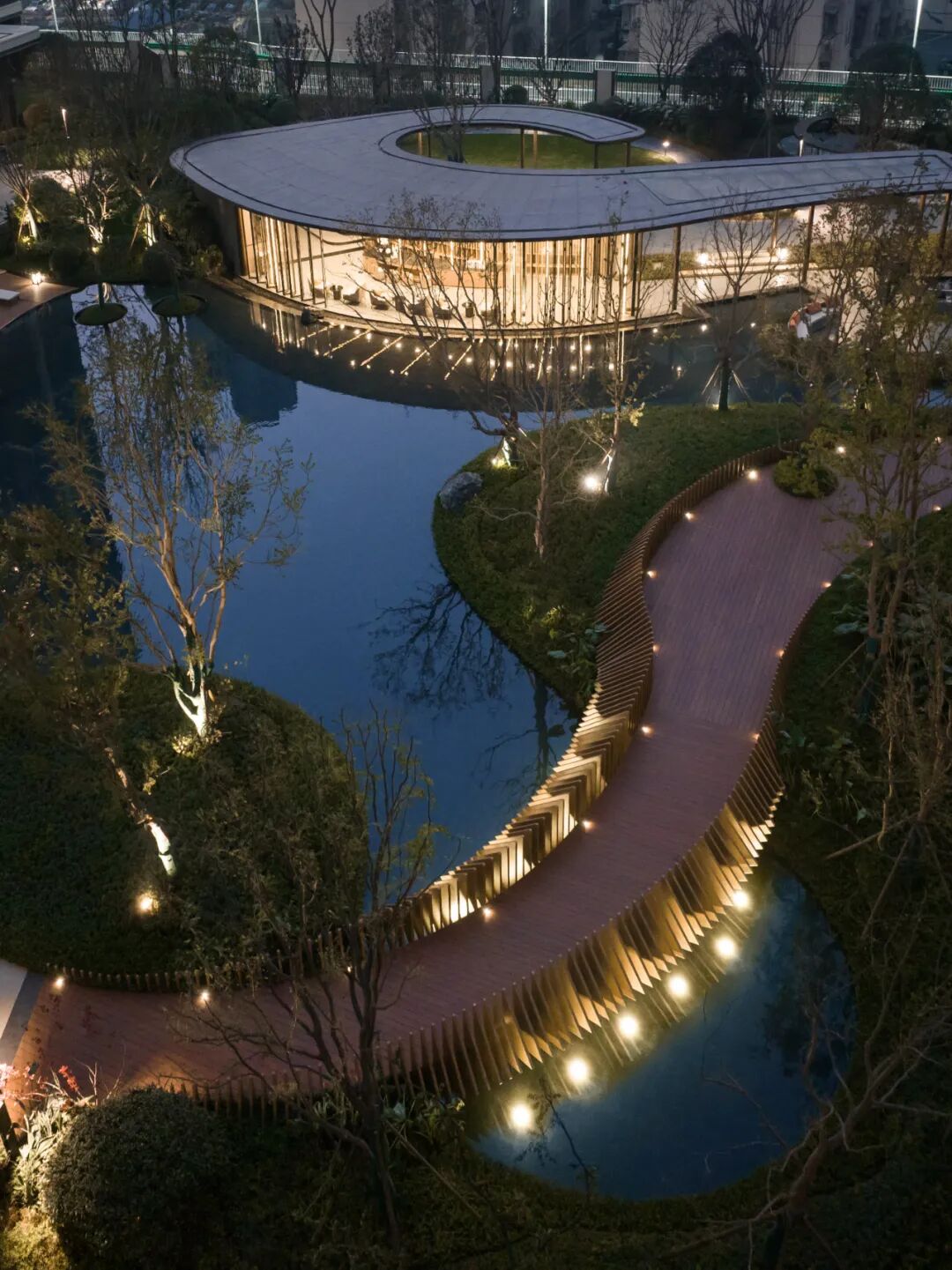 榉树夹道,高低错落的镜水叠台借势延伸“滩涂”的空间肌理。水旱两用的互动空间,静谧私享的大树林荫系统,平金夹绣的艺术演绎与声光电新技术结合,化身为生活故事的催化剂,创造社区焦点与话题。