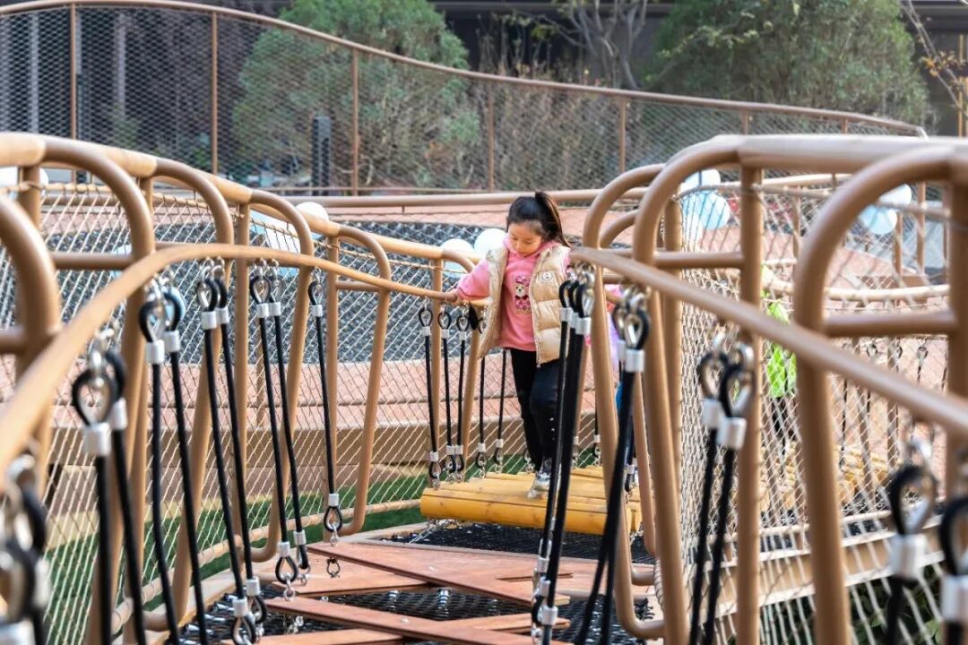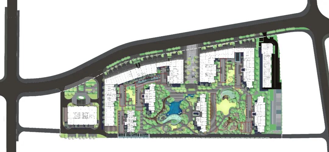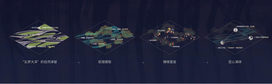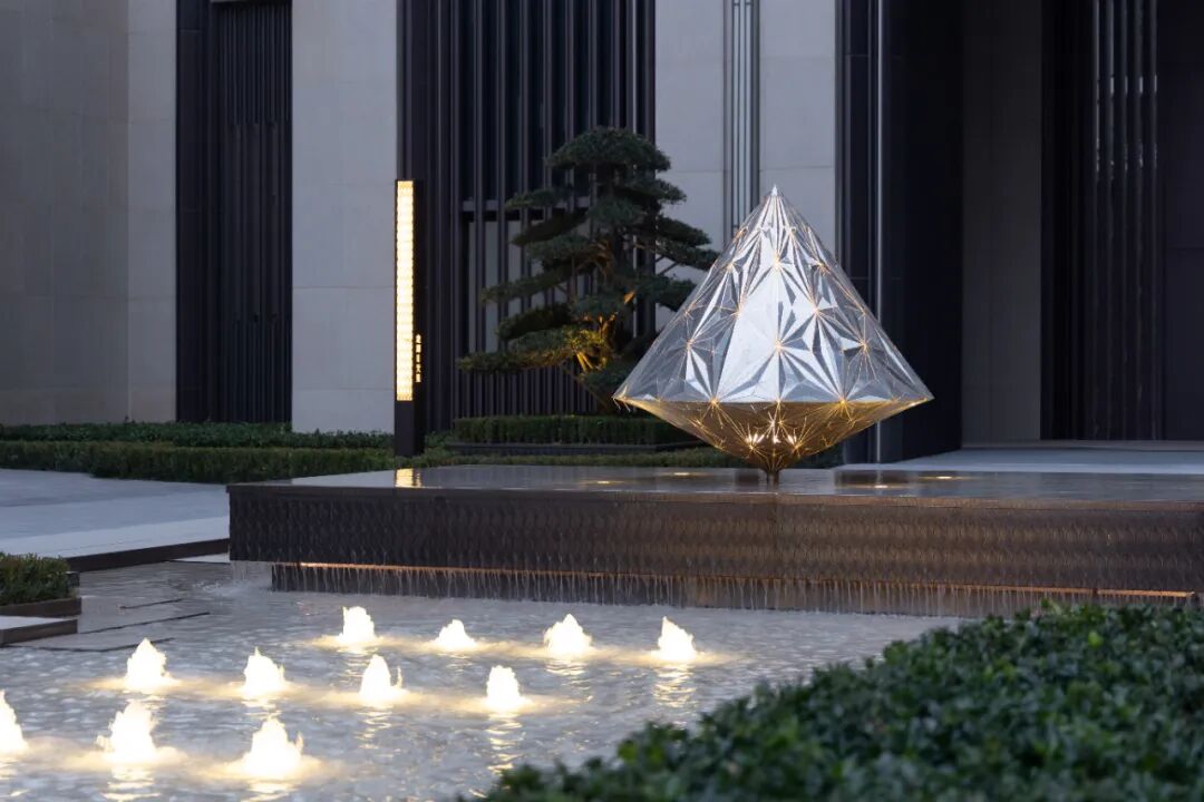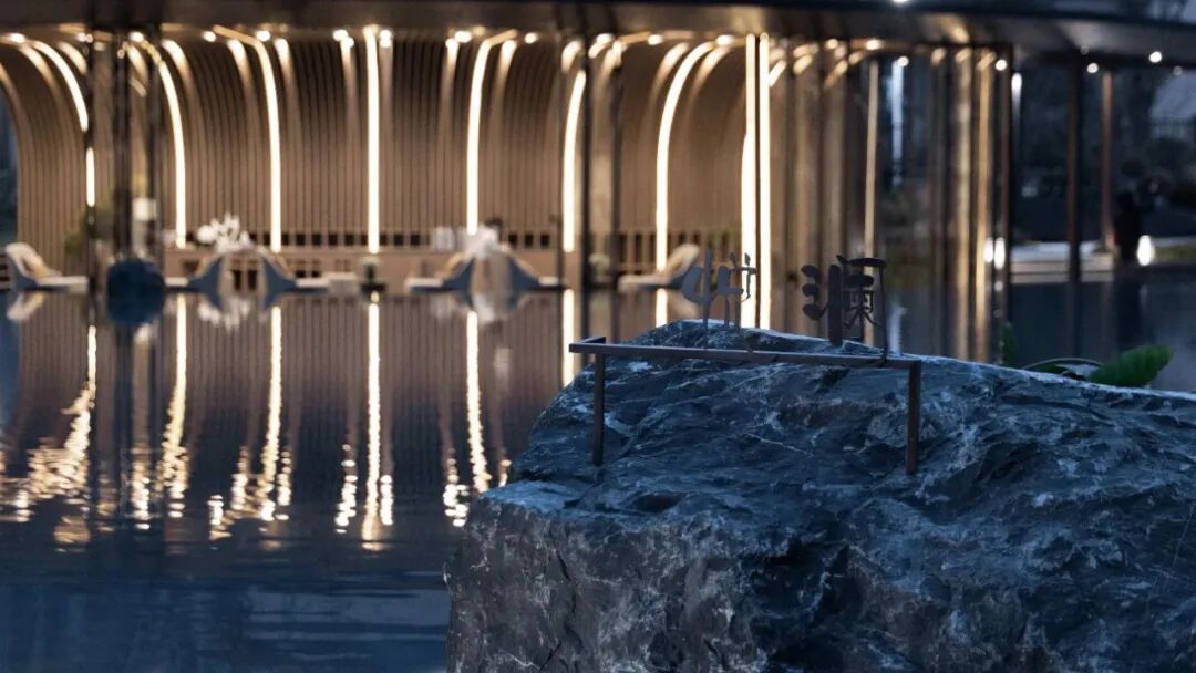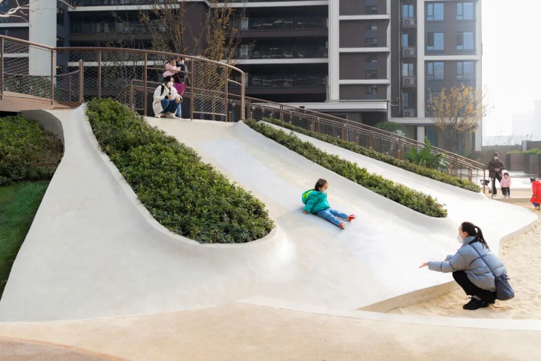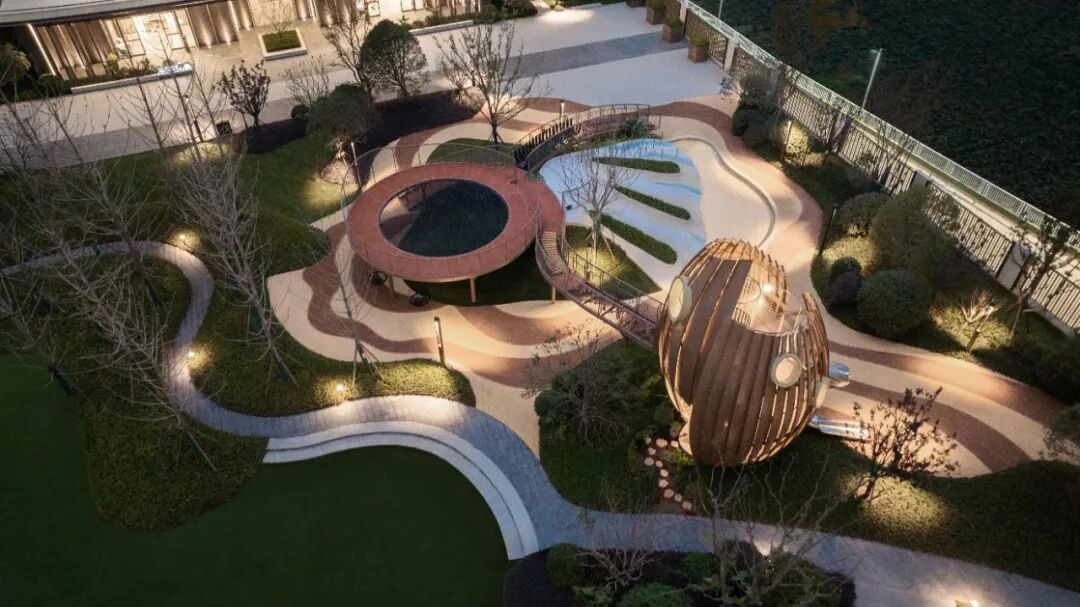 榉树夹道,高低错落的镜水叠台借势延伸“滩涂”的空间肌理。水旱两用的互动空间,静谧私享的大树林荫系统,平金夹绣的艺术演绎与声光电新技术结合,化身为生活故事的催化剂,创造社区焦点与话题。