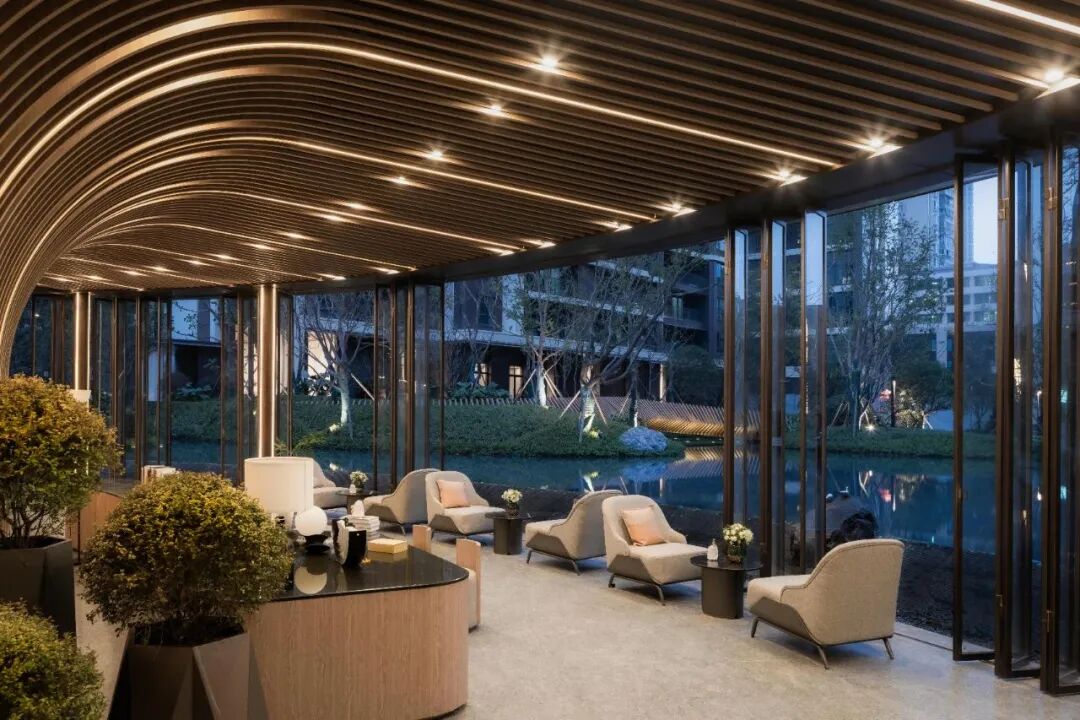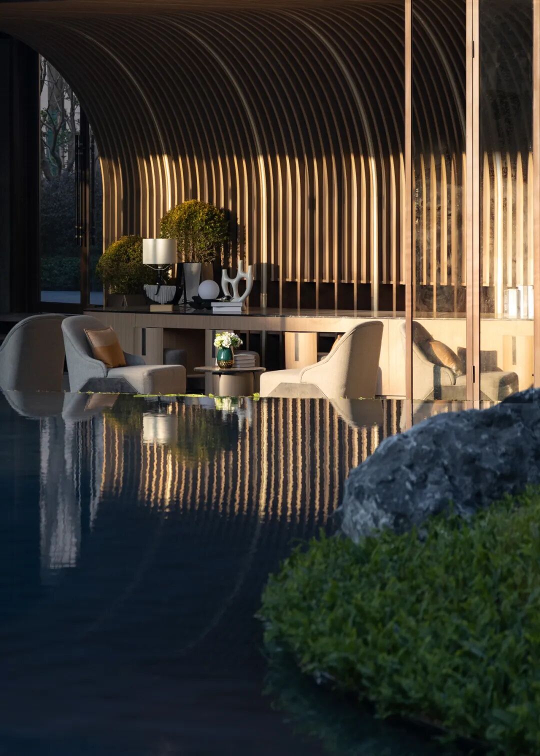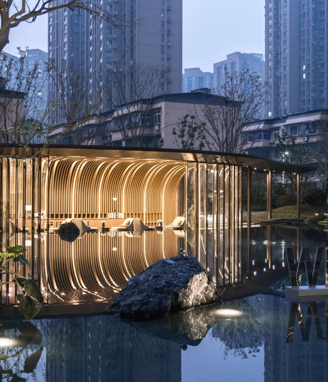 漂浮在水上干净简洁又精致的透明盒子,结合自由灵动的弧形铝板将天棚与内侧立面自成一体,如雕塑般点缀其中,通过镜像反射,倒映水中,与水景最大程度融合。