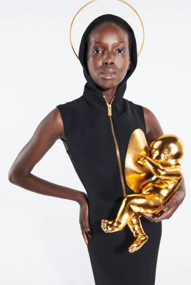 光环之下,模特单手抱着镀金婴儿雕塑,宛如圣母哺乳的造型,体现了创意总监Daniel Roseberry对于女性主义的探讨。尽管有时装评论博主Hautelemode指出这是近年来表现最为出彩的一季作品,然而业内人士以及网络上对于本季设计创意的评价却是两极分化,褒贬不一,来自GQ的Rachel Tashjian甚至感到自己的审美受到冒犯。