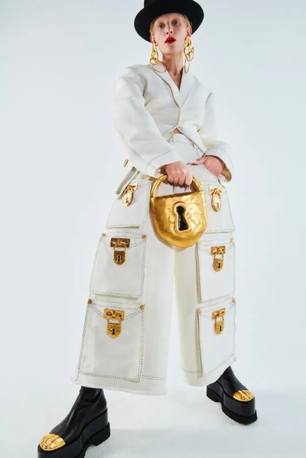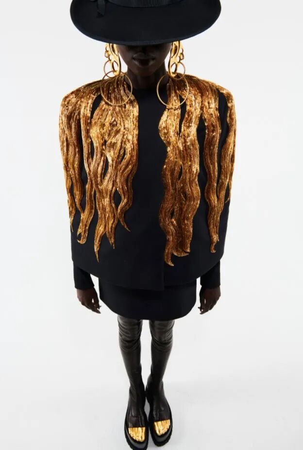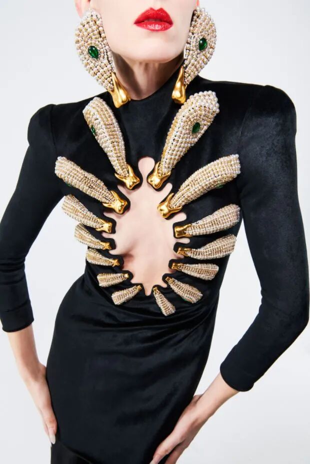 金鼻、金锁袋、金指甲,Daniel Roseberry 仿佛手持点石成金的法宝,为每一件时装都量身打造了极具魔幻色彩的可穿戴艺术品。