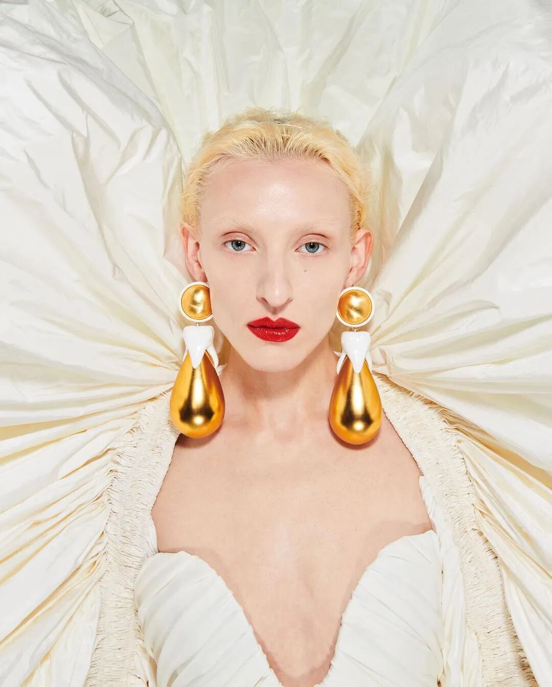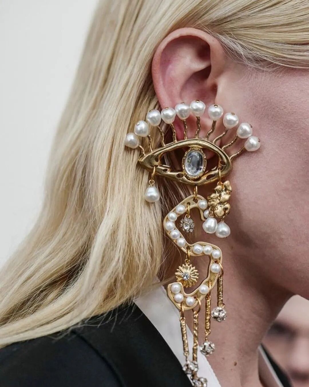 模特们穿戴上浮夸的镀金耳环、鼻钉、面罩,或是臂上妙手生花的金链和修长的指尖饰品,宛如从异次元穿梭而来般光怪陆离。