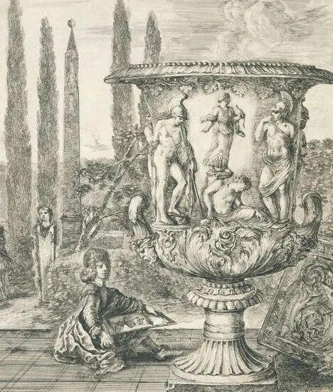 左:Stefano Della Bella1656年创作的这幅版画展示了美第奇别墅中的花瓶,画中男孩被认为是美第奇家族继承人 / 右:此幅画作很可能是这款塞弗尔花瓶的灵感来源,V&A藏