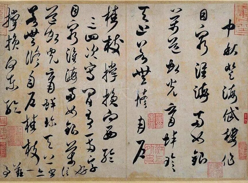 《中秋帖》字形大小正斜组合,行草相杂,书法古厚,墨彩鲜润,字距布置紧密,运行流利,连断往复。整幅字守中线,行间透气,齐头平脚,气韵贯通,雄浑奔放,气吞万里。