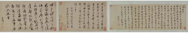 在帖中米芾前后共抄录诗文两次,中间加入一行批注:“三四次写间有一两字好,信书亦一难事”,可见对书法求好的态度。