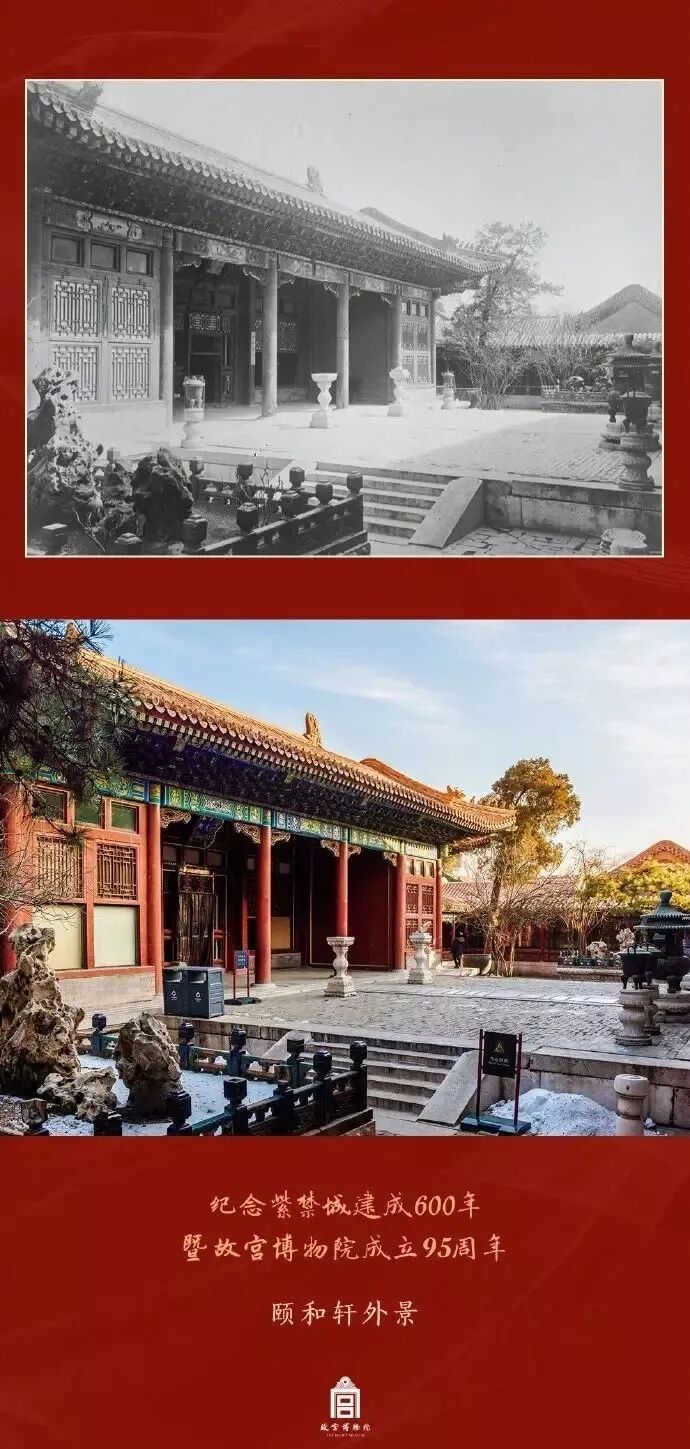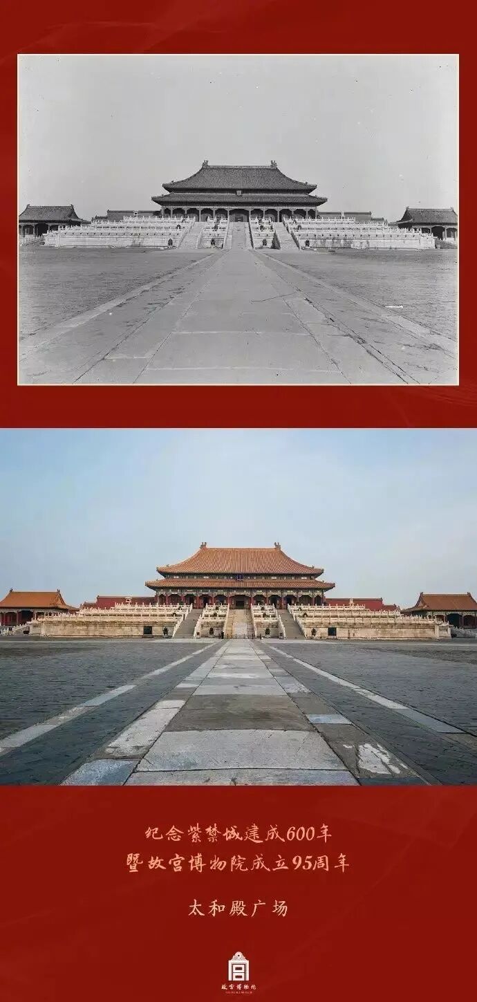 此前故宫曾发布过一组故宫今昔对照的照片。站在紫禁城中凝望,新老照片仿佛将时间之河折叠,历史与当下重合。紫禁城从时间的洪流里走来,却依旧美丽。