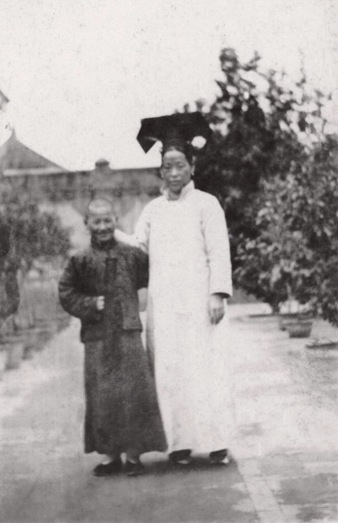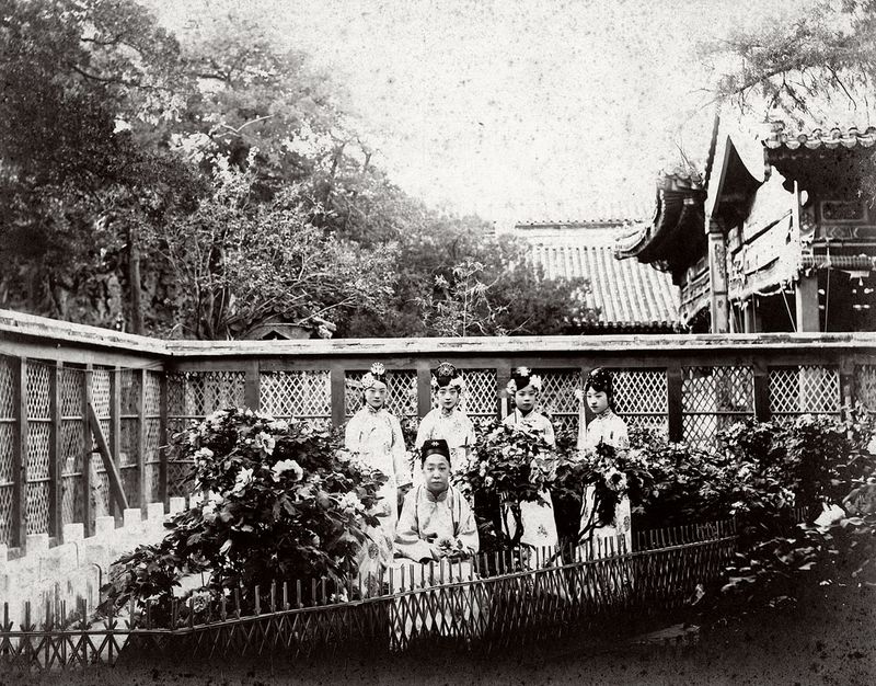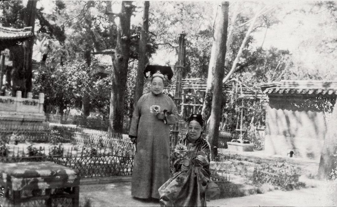 20世纪初 端康太妃与宫女摘花留影 摄于御花园 左为宫女,右为端康太妃。照片右下角印有“北京电话西局贞记照相馆二三八一护国寺街西口路北”字样。