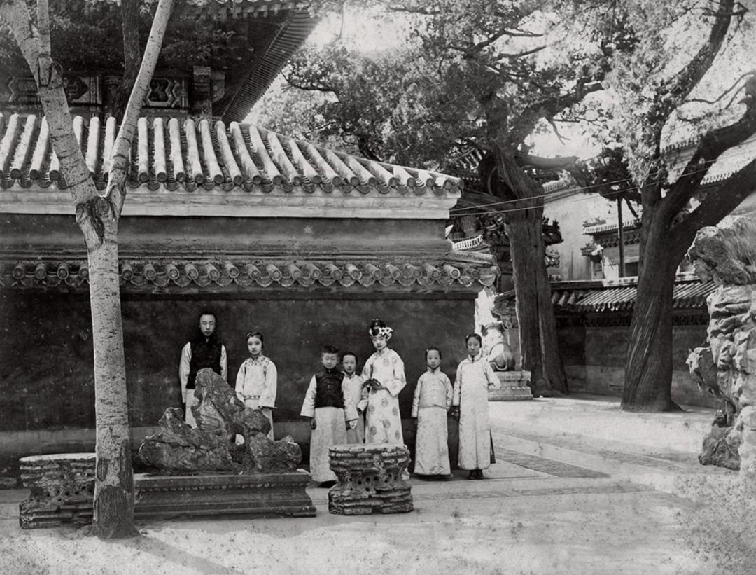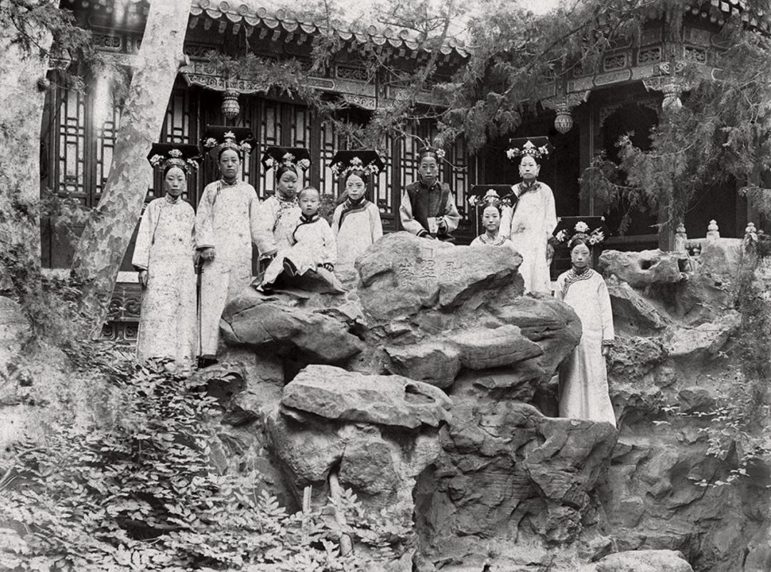 20世纪初 端康太妃与婉容、文绣等人合影 摄于御花园前排为端康太妃、后排左二为婉容、左三为文绣、左四为唐石霞。
