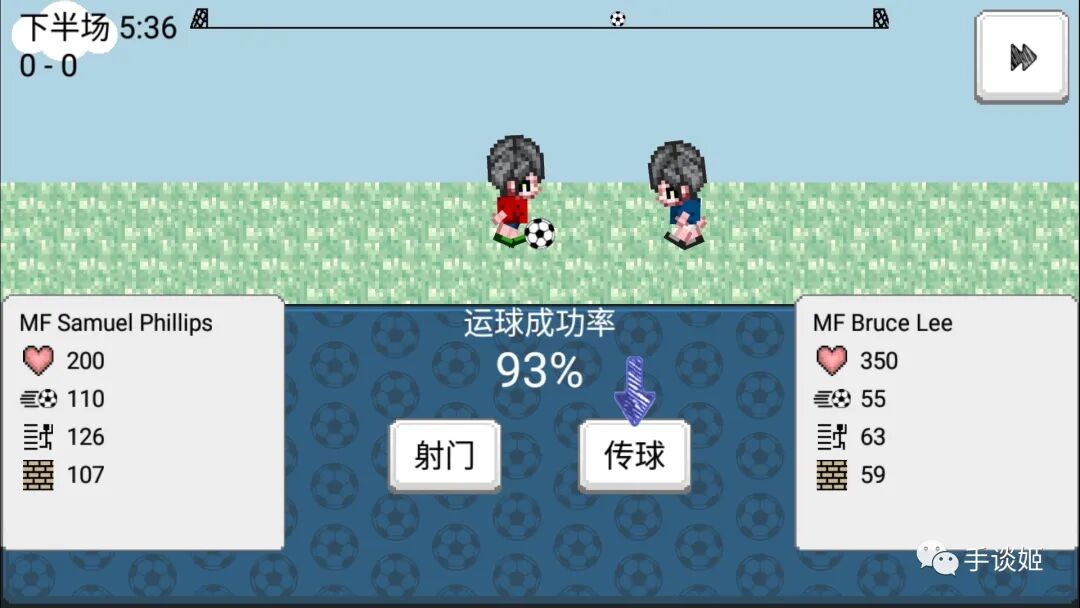 接着来说说足球赛,作为一个独立游戏,比赛的过程相当紧张刺激……才怪。球赛采用了左右对线的形式,我方在左,敌方在右,球员通过比拼数值的硬实力来达到带球过人、传球,以及射门。
