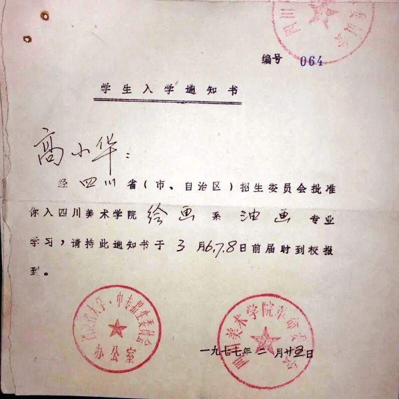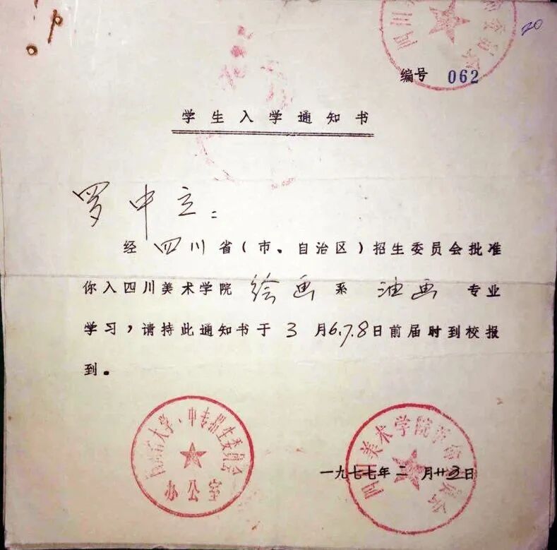 1977年罗中立入学通知书