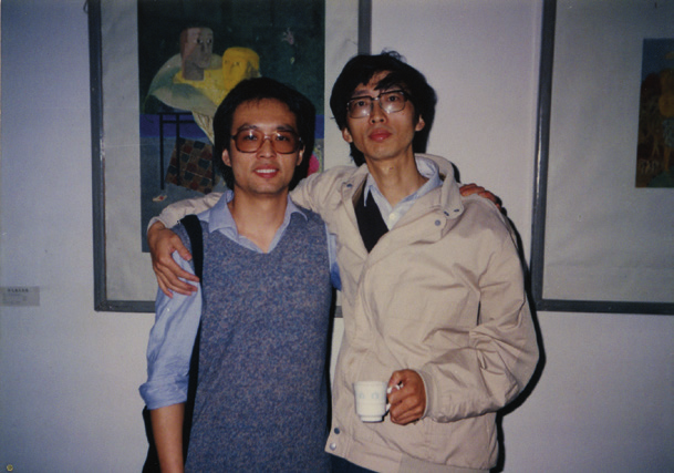 1989年张晓刚在个展开幕现场与王林一起