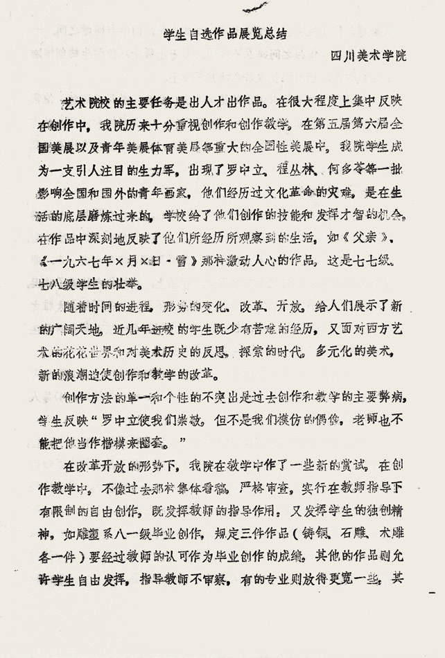 “老师和学生在造型艺术上萌发的创作构想和表现形式,正是我所期待的。自选展览和当年野草画展一样,面对难以通过的审查,只好自己办、民办,争取表达的空间。学校为他们提供空间,最后也会影响到学生。川美出现自选作品展,与当时大环境有关。在这之前文化部在川美召开的5天关于创作教学的会议,在全国造成了非常大的影响。这就确立了川美以创作带动教学的传统,这一段历史川美影响全国。”