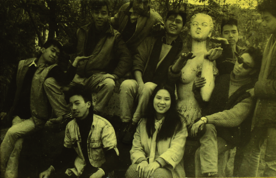 喻德刚、沈小彤、张濒、罗嗣勇、叶蘋(叶毓山女儿)、刘卫东、陈晓等在美院礼堂旁边的雕塑前摆造型