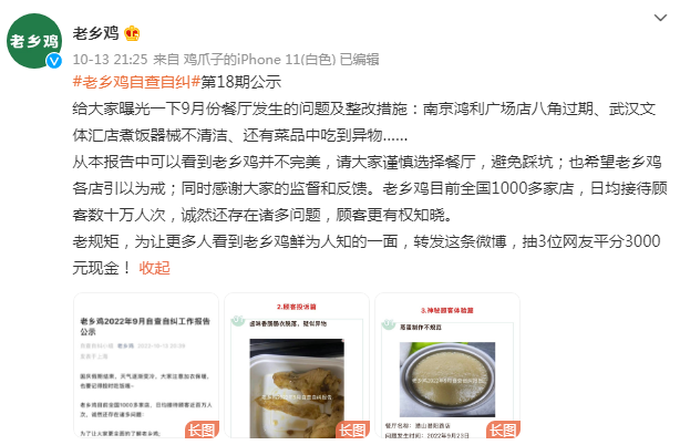 为了让自家的“丑闻”众人皆知,老乡鸡的官微甚至还不惜拿出了数千元现金对转发的网友进行奖励,这种自黑的“主动劲”,仿佛针对的并不是自家的品牌。