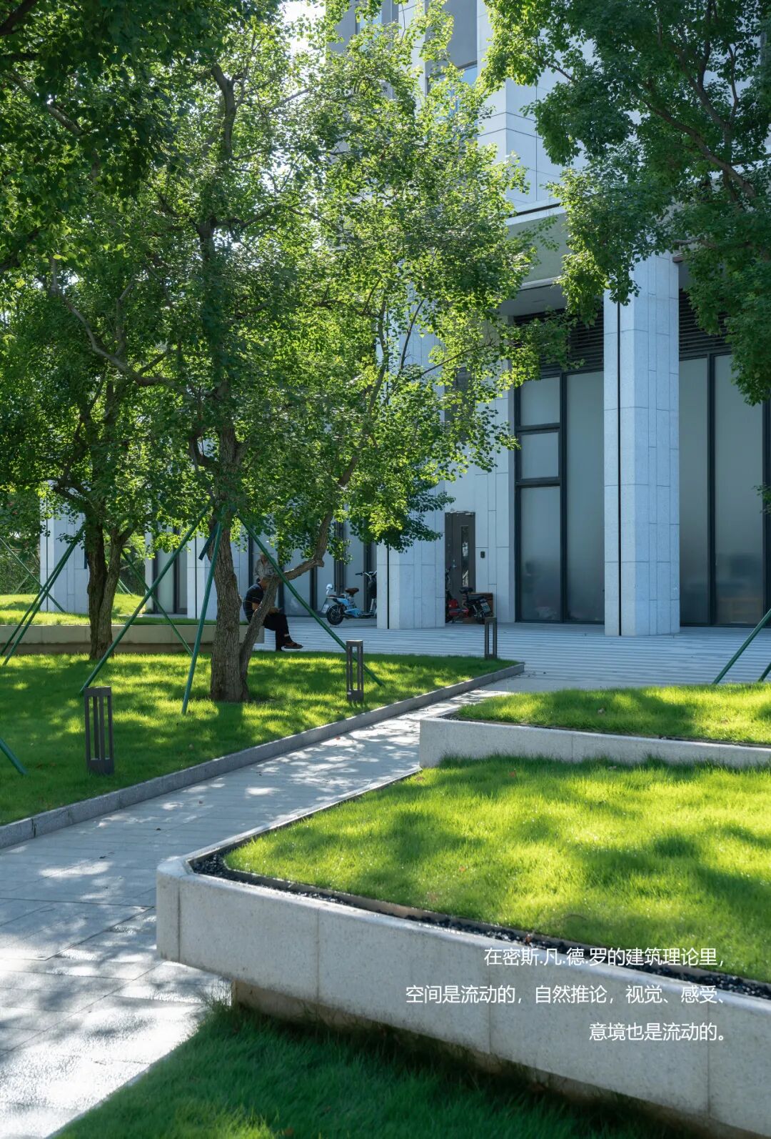 项目地块由于城市规划条件被“一分为二”,我们思考在项目的第一界面空间打造一个承接过去与未来的“横向城市客厅”,作为连接新老城区的绿色纽带;南北地块为不规则几何夹角空间,整体狭长且空间分散,在密斯.凡.德.罗的建筑理论里,空间是流动的,自然推论,视觉、感受、意境也是流动的,我们在场地中引入一条流动的“纵向生活主轴”,作为连接南北地块的绿色走廊。