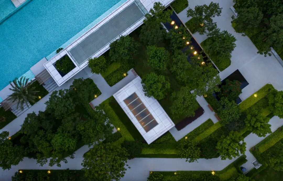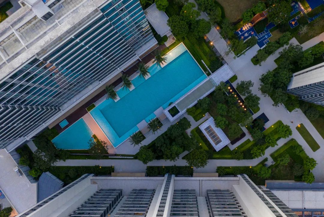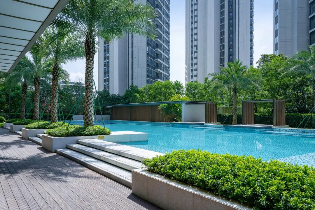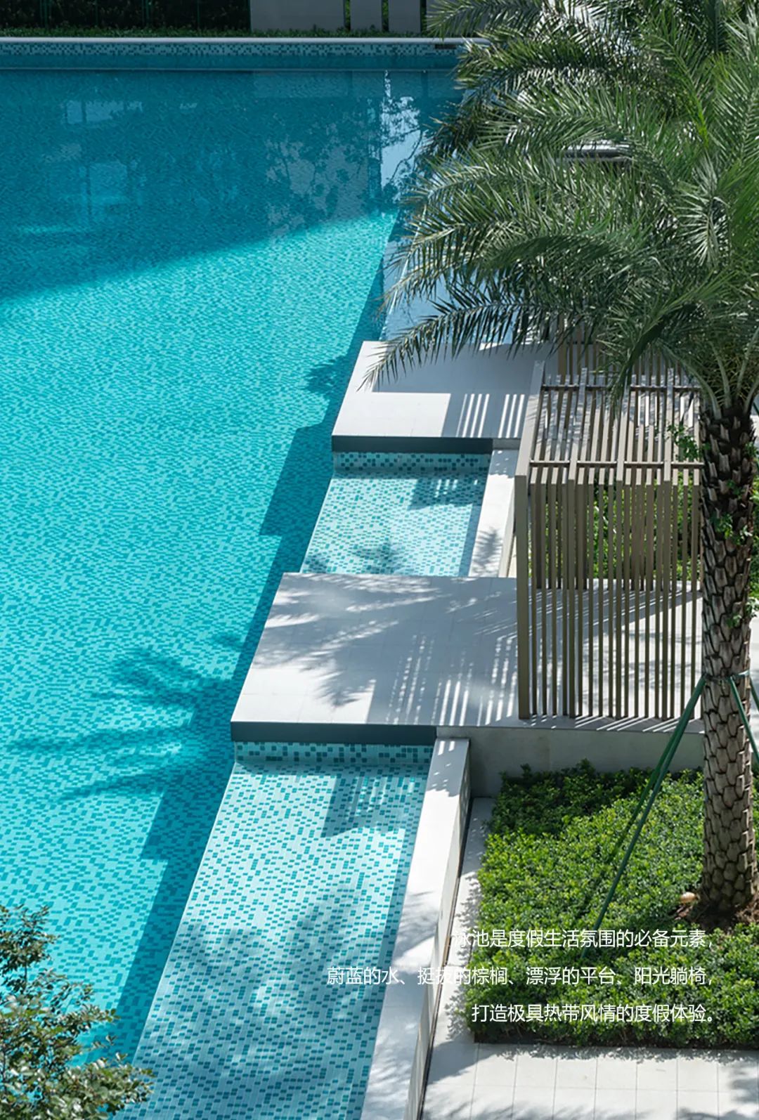 为了营造一种度假的仪式感,我们选择用地块中最大的绿地空间做泳池设计,泳池是度假生活氛围的必备元素,蔚蓝的水、挺拔的棕榈、漂浮的平台、阳光躺椅,打造极具热带风情的度假体验。泳池整体设计我们希望用更加科技现代、艺术简约的手法营造时尚轻奢的生活格调;并且结合架空层配置酒店化的专属更衣室和健身房,实用功能与美不露声色的融合,使居住者得到犹如身临度假酒店般的感受,在“舒适的家”这样的一个概念之上,增添和加深了愉快的生活体验,推崇休闲与舒适相结合的度假式生活体验,并以人为本的设计理念,自然巧妙地运用自然环境来营造出一个高端住宅社区专属的场景,给业主打造高品质的生活享受。