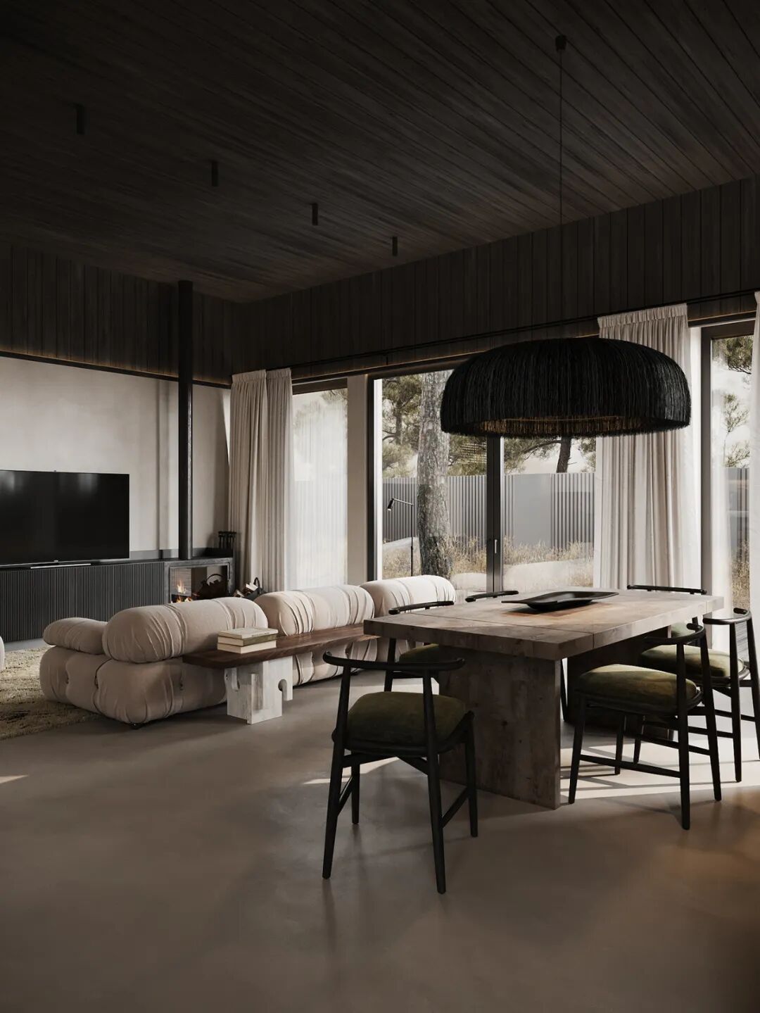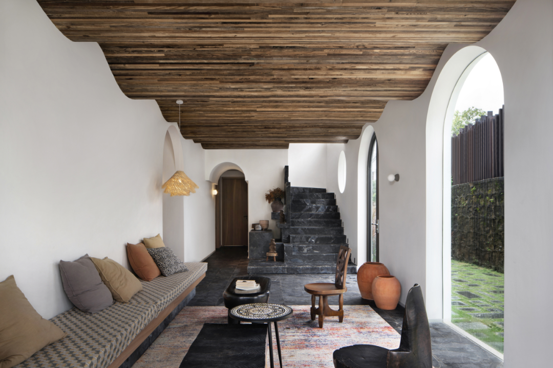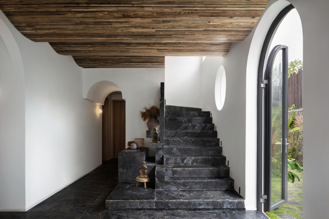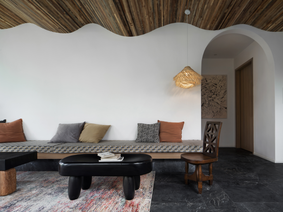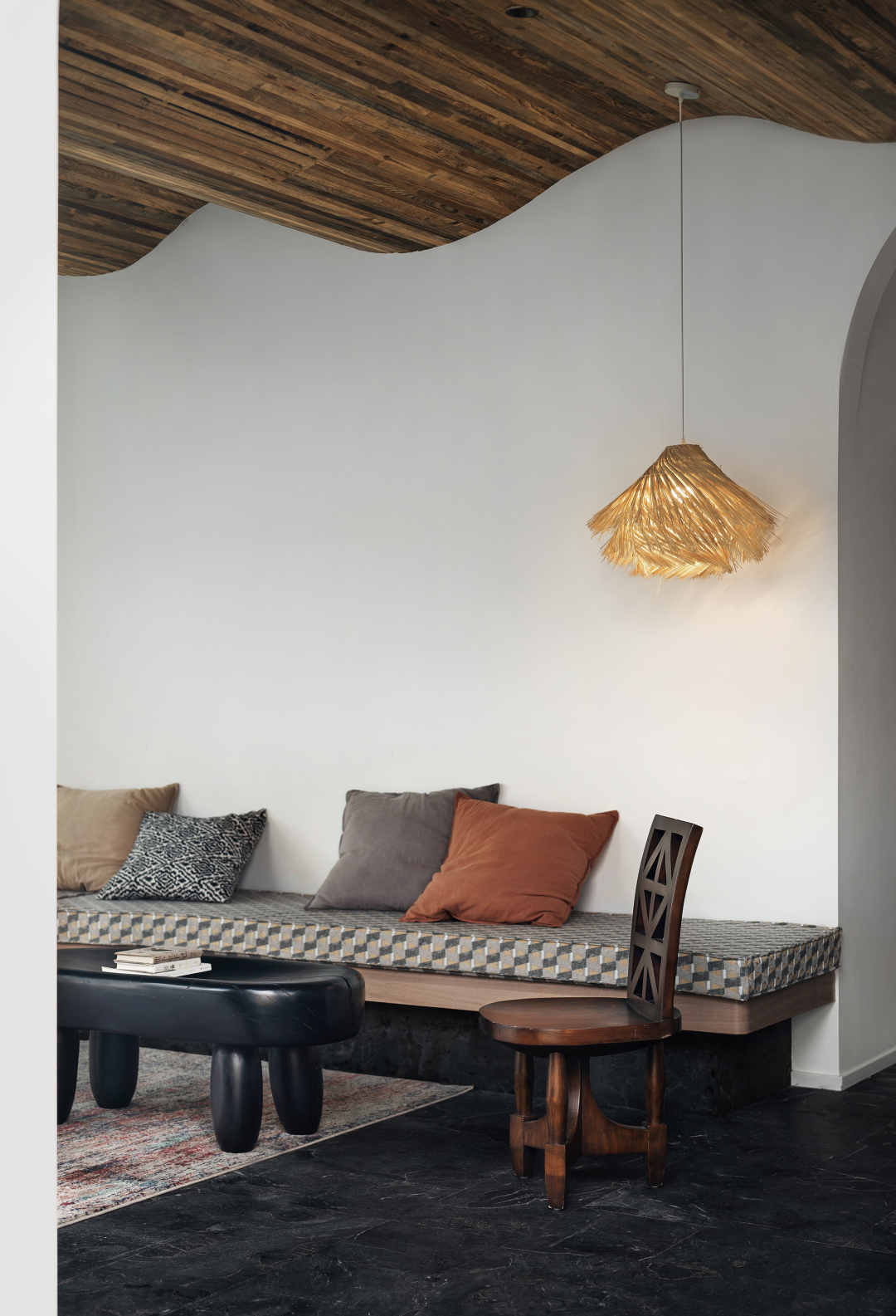 室内外的连接作为设计的核心思考,通过借景的手法将室外的自然景观最大化的引入室内,突破边界界限。曲面的原木天花板下,承载着地中海热烈的风情,混合着中古家具的沉稳基调,为入住者提供了一方彰显品位的社交场域。