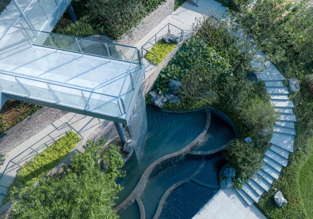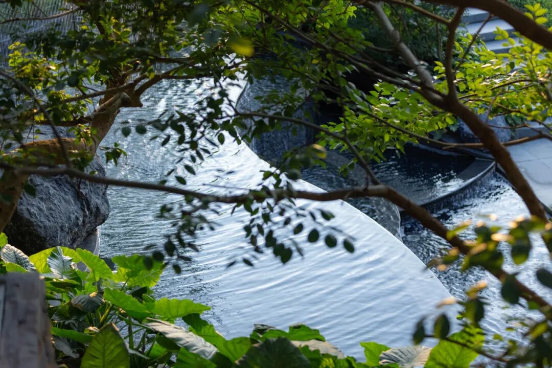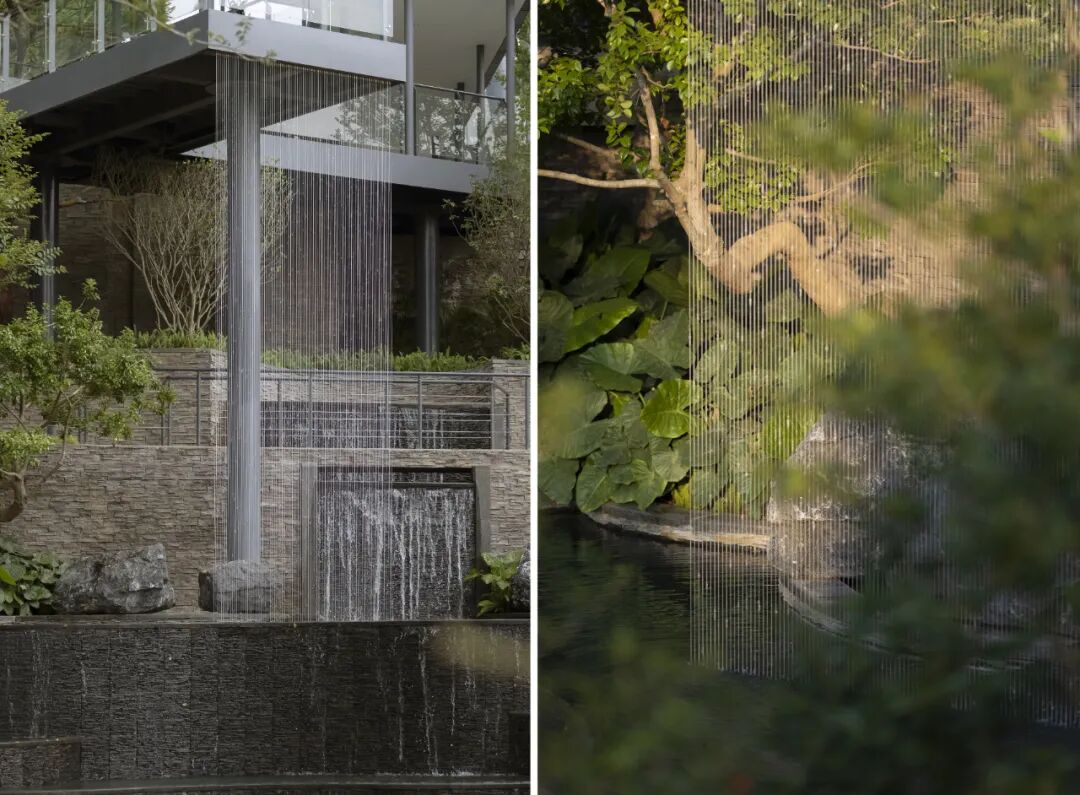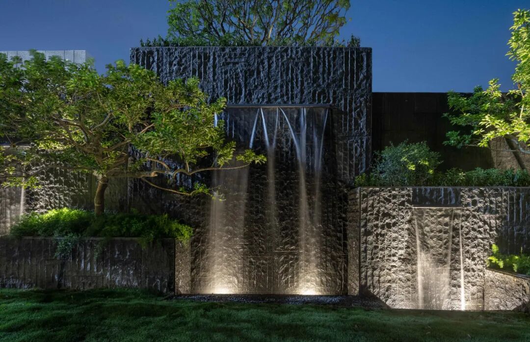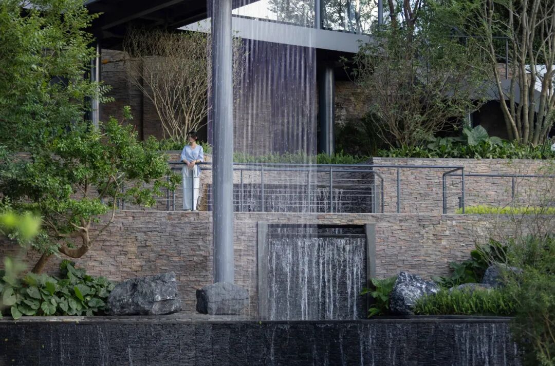 基于对场地及周边环境的解读,设计延续山水脉络,巧用地形条件,形成跌水瀑布,点植飘逸多姿的观叶植物。透过视觉、听觉、触觉,创造一个城市里的自然意境院落,彰显水景庭院的大气、舒适之感。