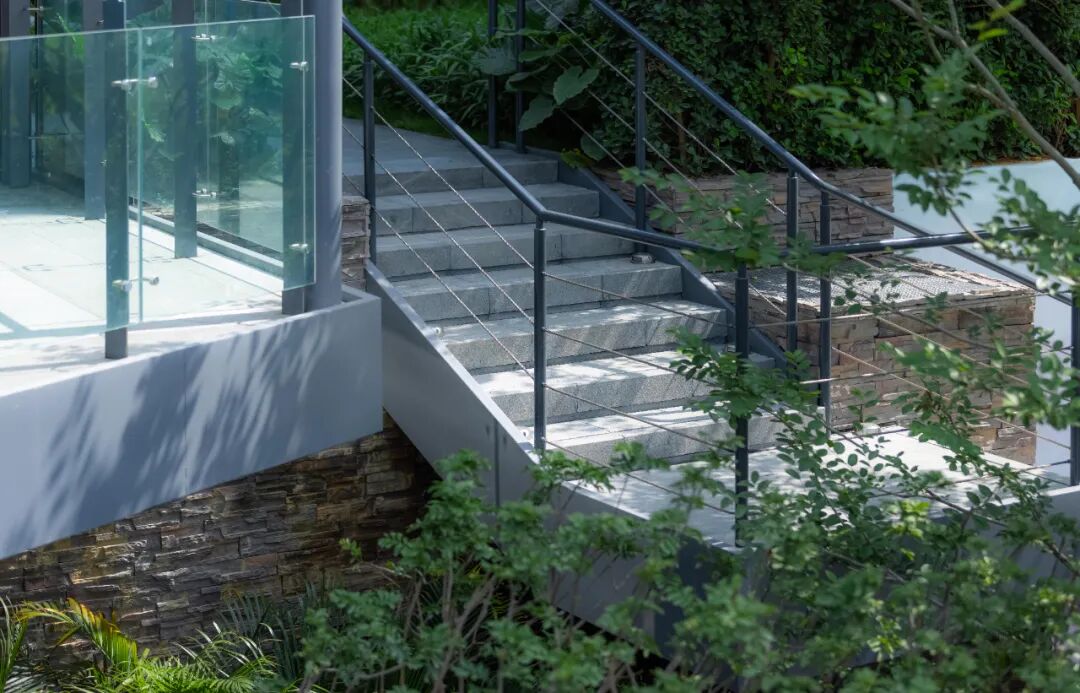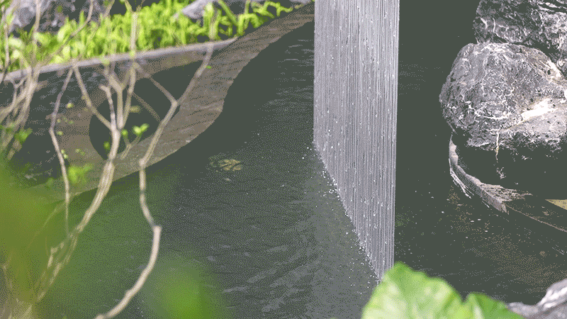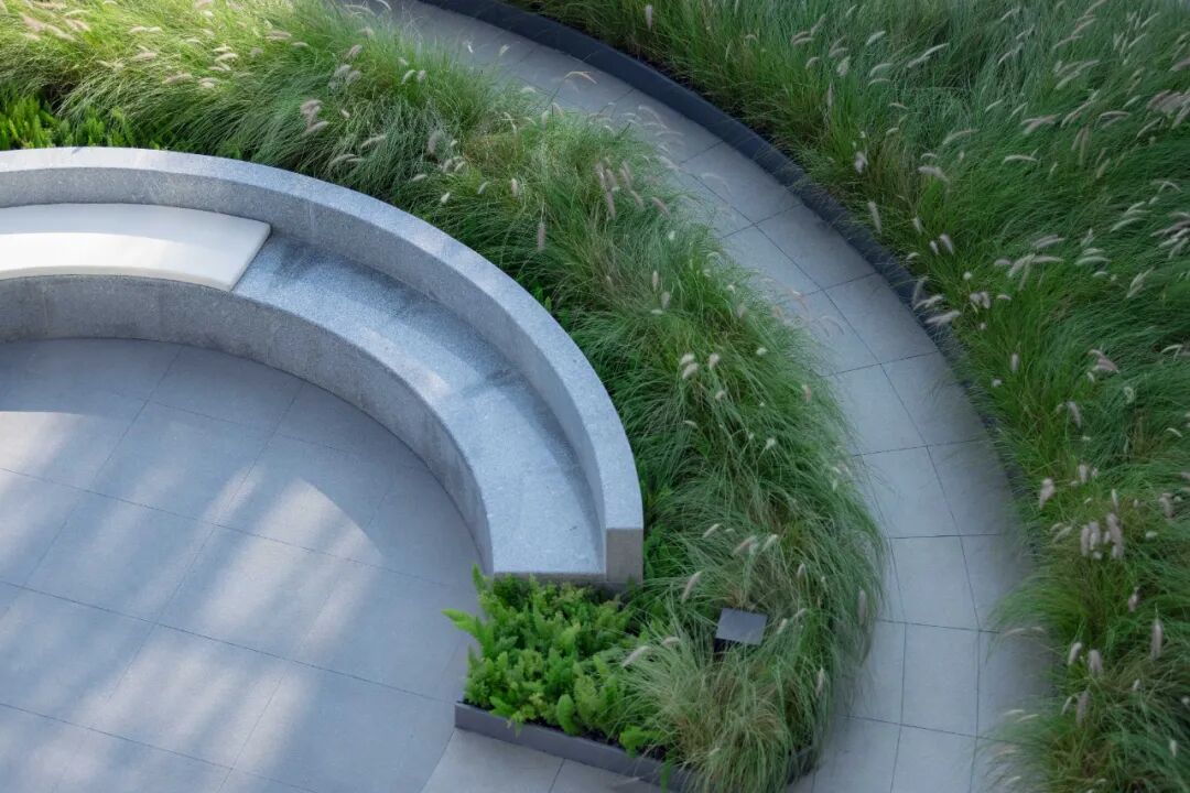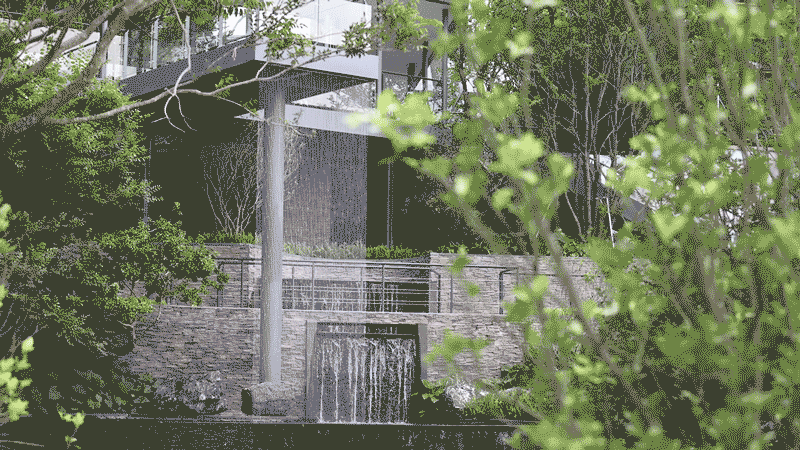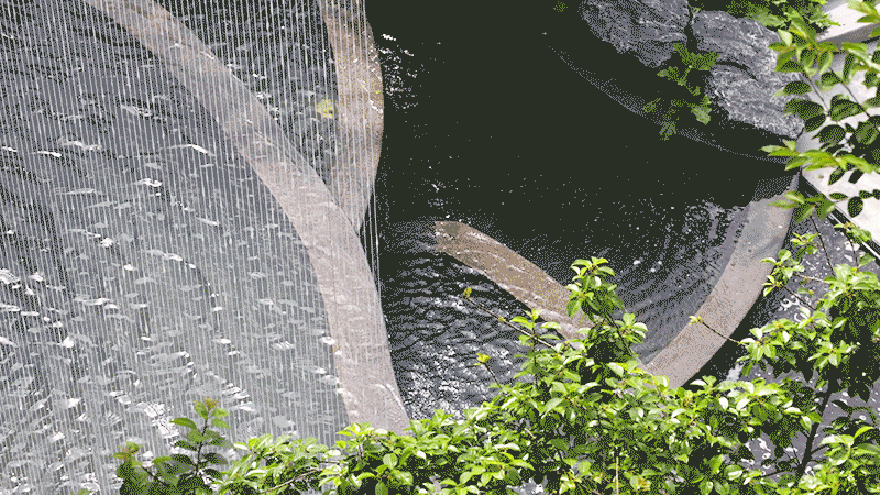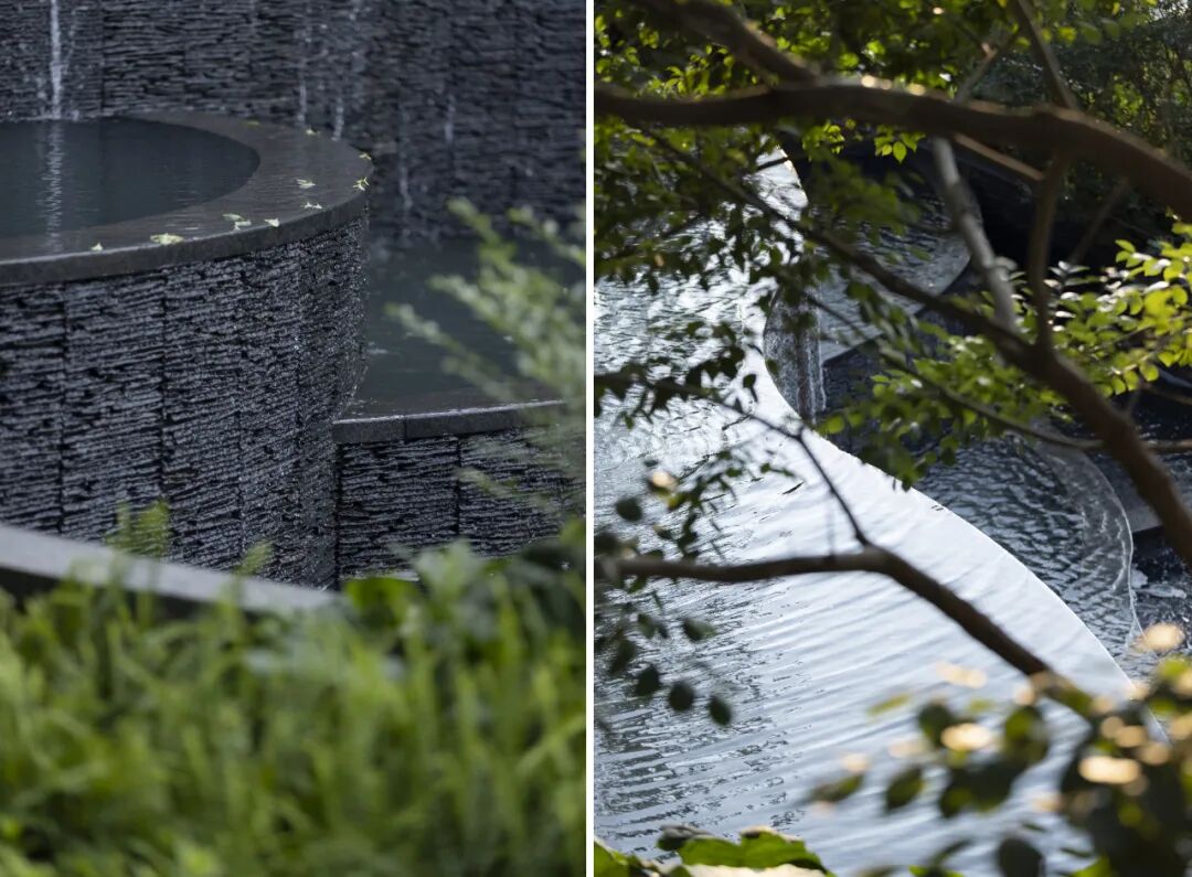 基于对场地及周边环境的解读,设计延续山水脉络,巧用地形条件,形成跌水瀑布,点植飘逸多姿的观叶植物。透过视觉、听觉、触觉,创造一个城市里的自然意境院落,彰显水景庭院的大气、舒适之感。