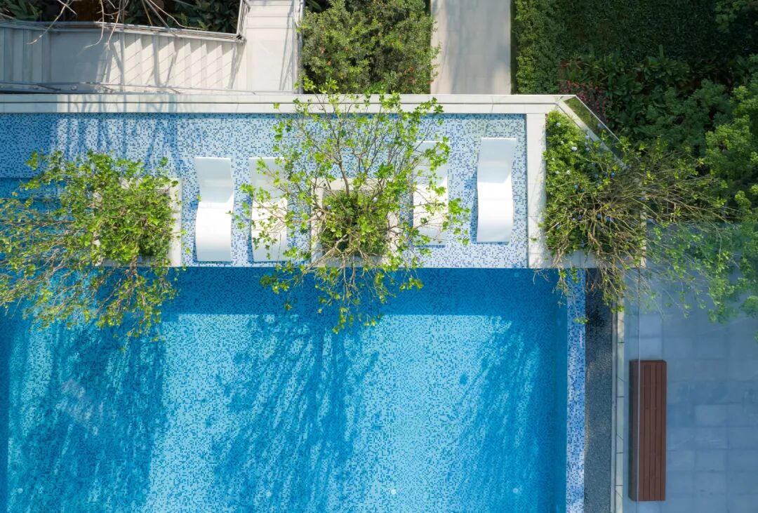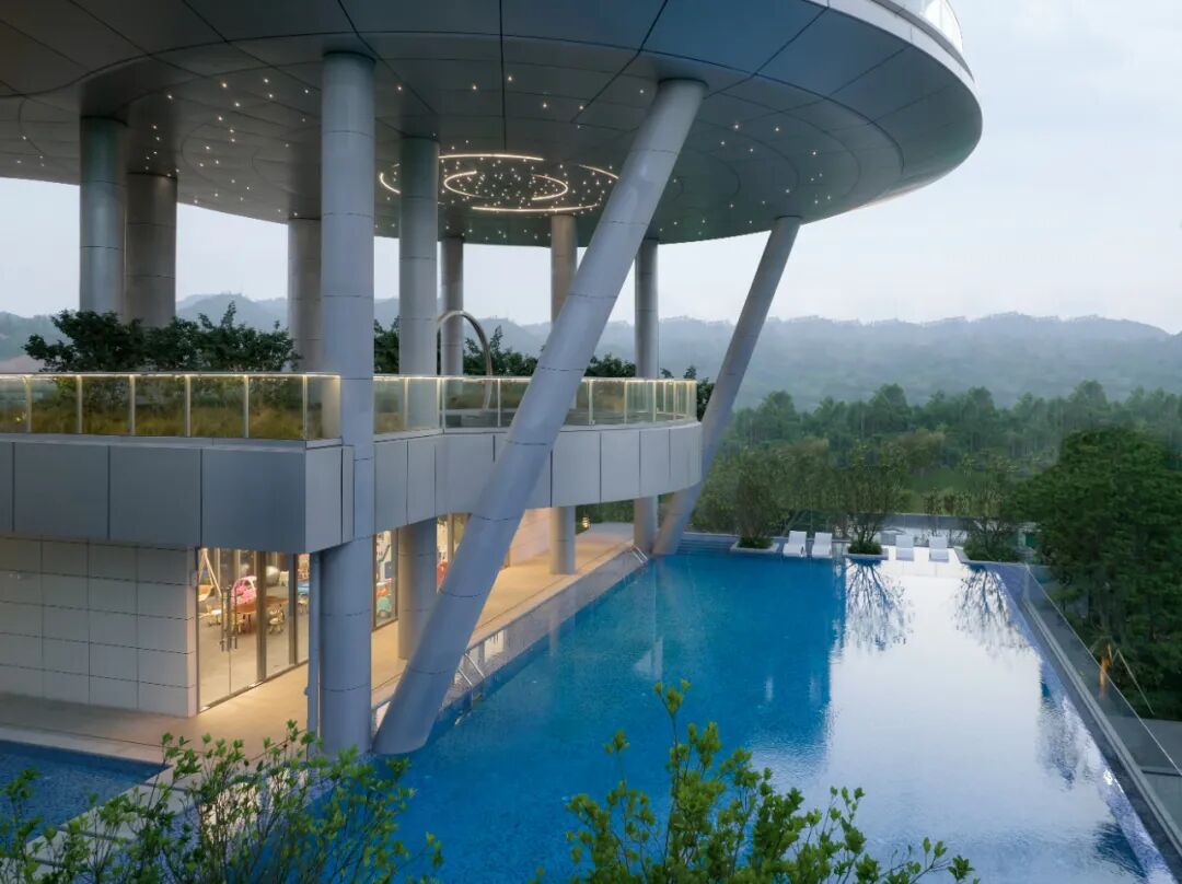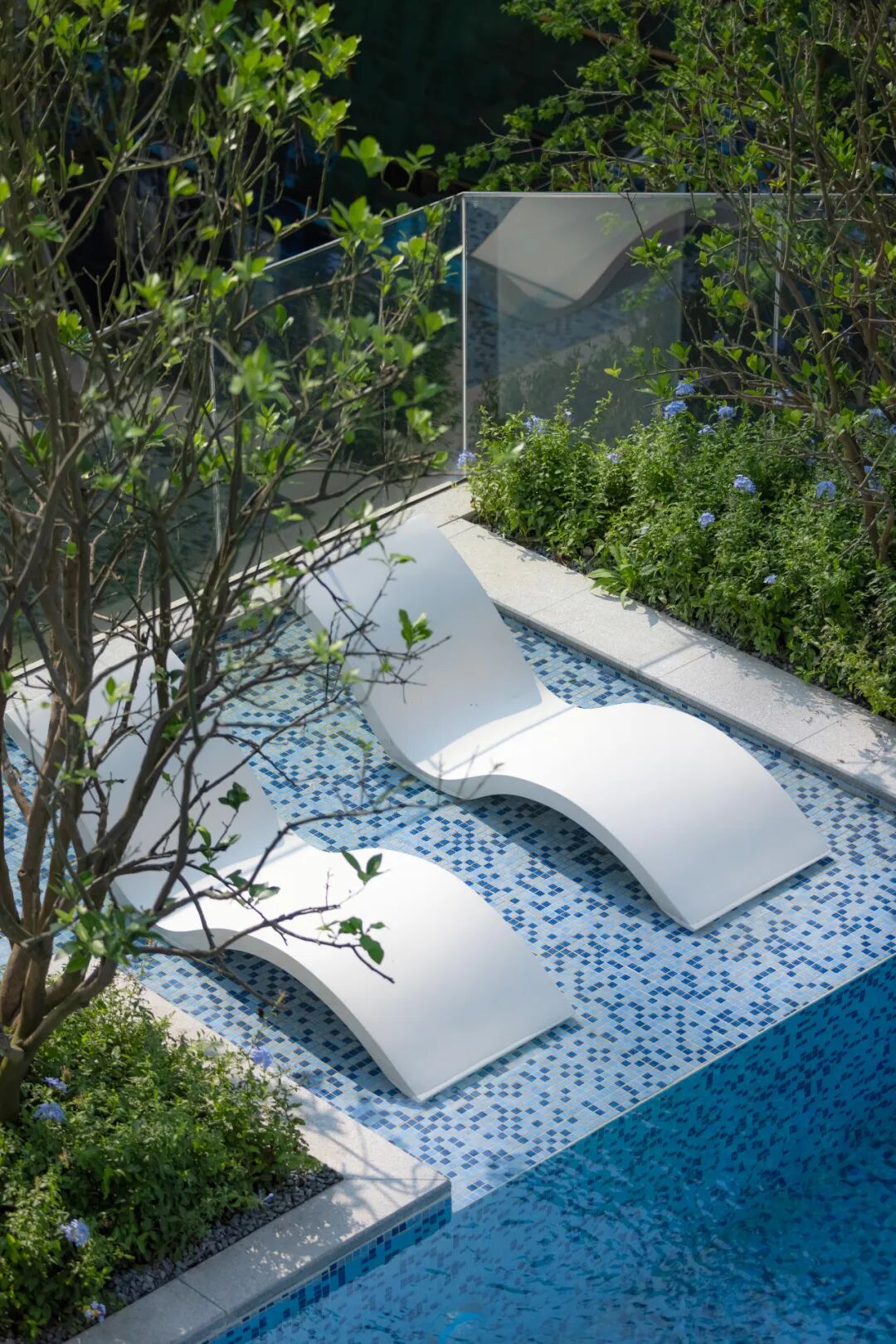 全龄无边际泳池,水中休闲区,水上躺椅,柚子树与水景交织一片,花光叶影,水光云影,含蓄雅致,清幽澹逸,乐而忘俗。整体空间描绘出一幅恬静和谐、极富自然质朴气息的佳境。