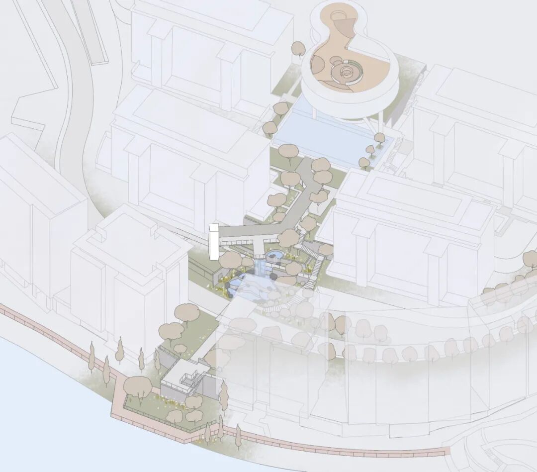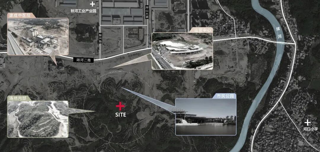 场地内高差较大,地形丰富,植被茂盛,外围有已建成中医院及市民公园。如何利用地形高差,构筑满足人居需求、顺应自然并与生态环境相融的景观。实现自然、建筑、景观与人的交流互动,是此次设计的难点与亮点。