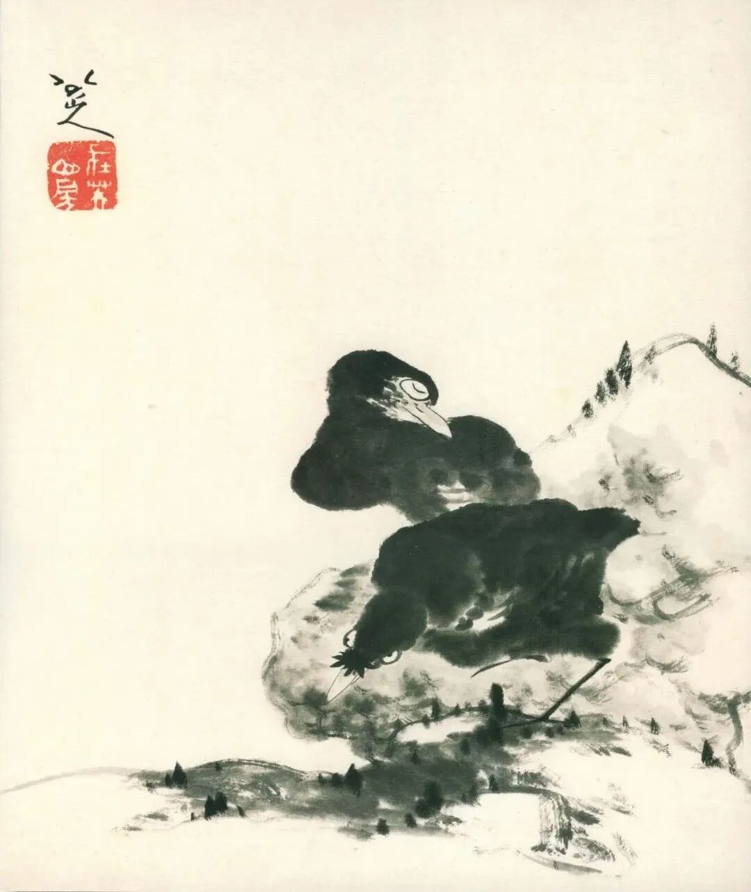 此外,作为清初四僧的八大山人,无疑又是继徐渭之后的又一高峰。他以豪迈沉郁的风格,简约变形甚至带有怪诞意味的独特画法,推动了中国大写意花鸟画的时代进程。他的突出贡献表现为:造型上运用高度概括的形象,以寥寥数笔的夸张的手法,将笔下花鸟拟人化,产生以少胜多,朴拙灵动、清空潇洒的艺术境界。尤其是八大山人在构图方法上引入源于山水画的“三远法”,将其灵活地运用,以仰视与俯视相结合的手法,使两种观察方法同时出现在一个画面上,配合高超的留白技巧,从而使空间得到无限延展,给予观者更广阔的想象空间,这种创造性运用也是大写意花鸟画在八大山人推动下所取得重大拓展。