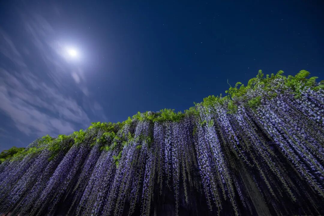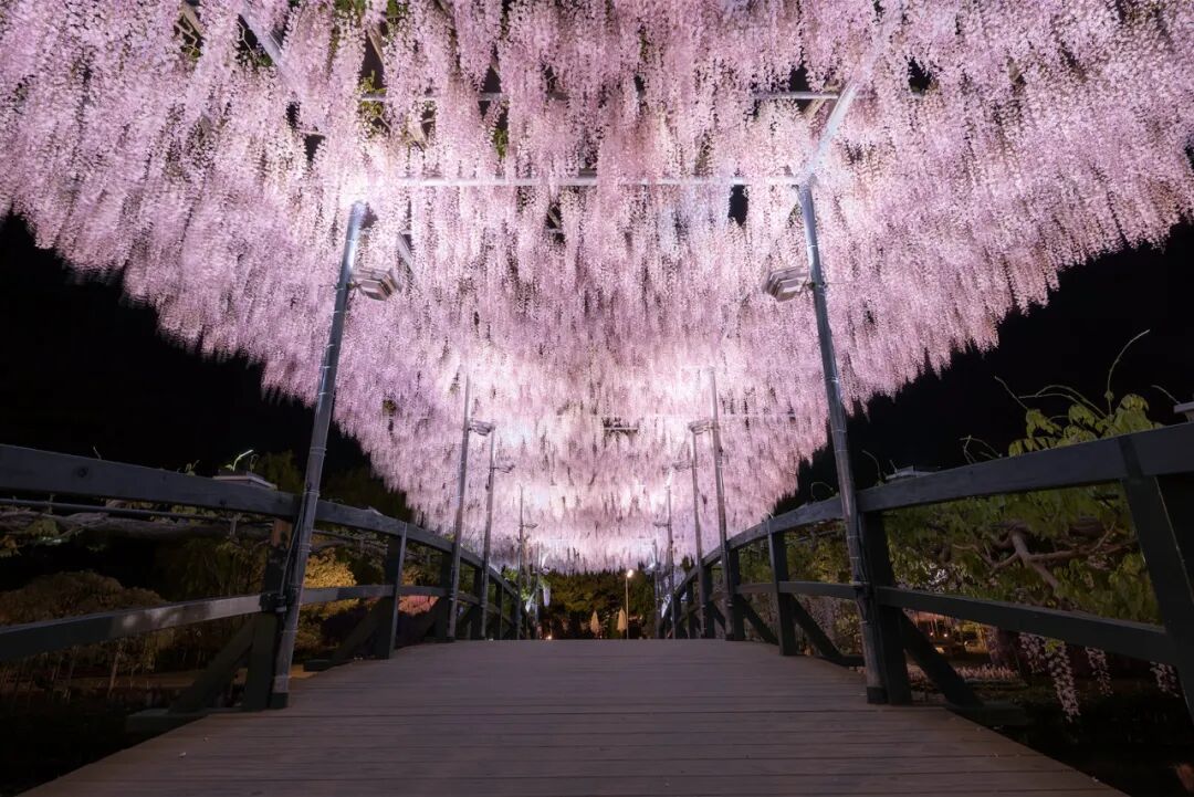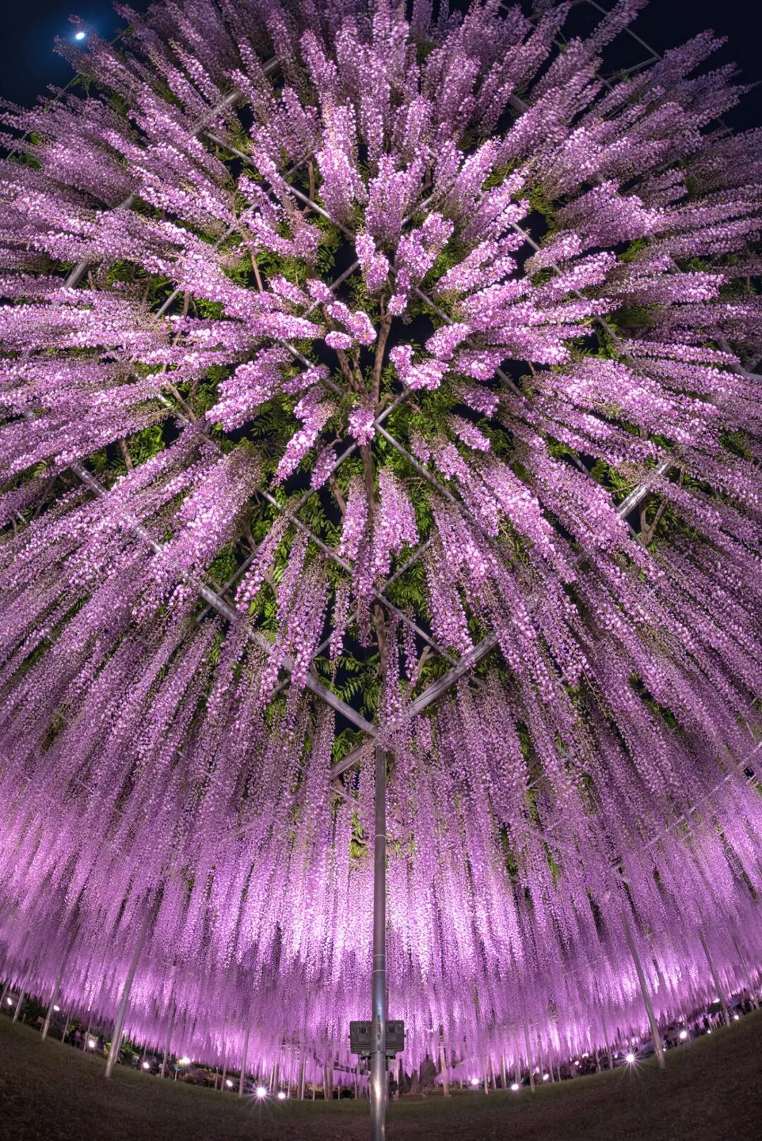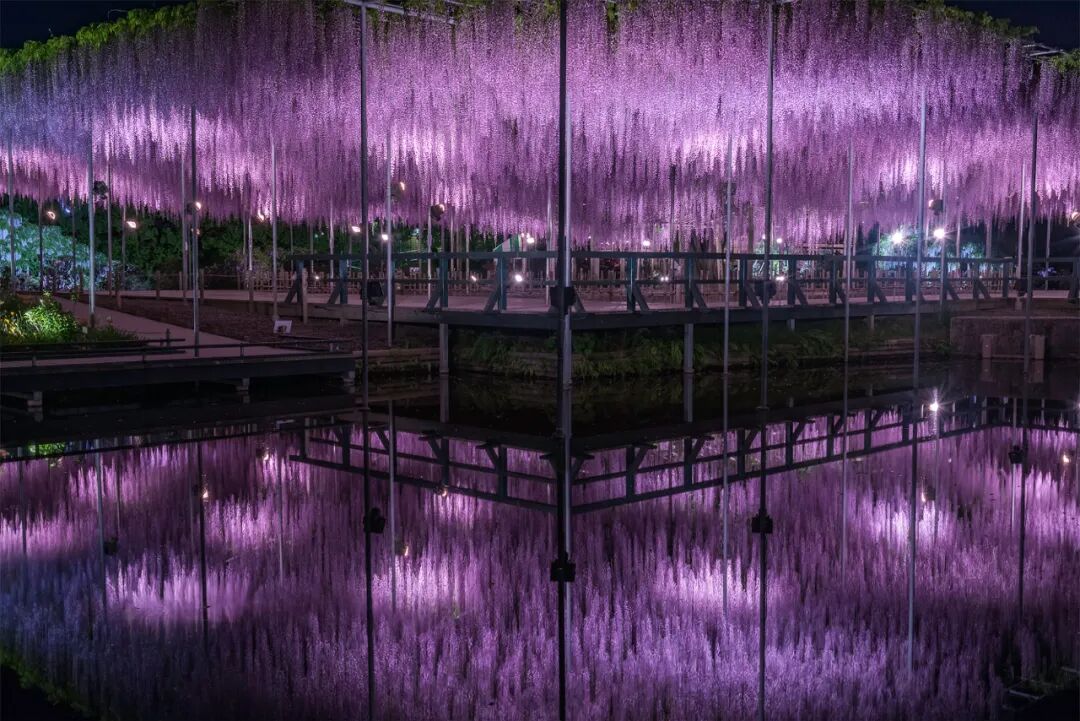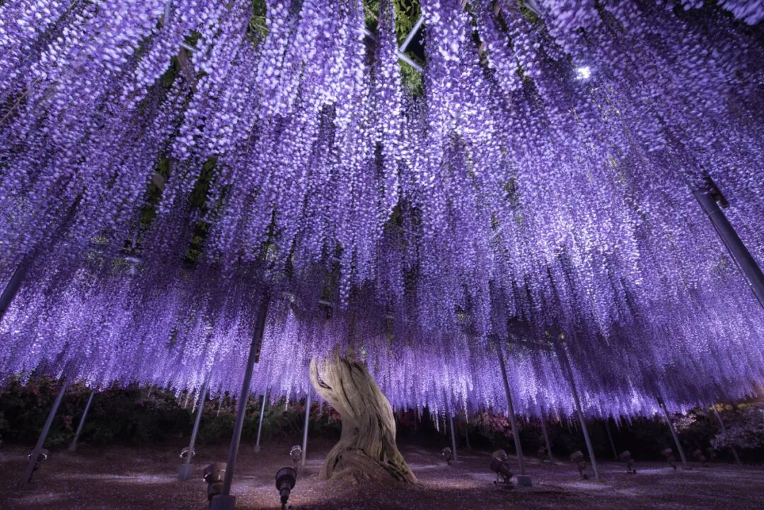 每年春天,日本枥木县的足利花卉公园都会被明亮的、盛开的紫色花冠所淹没。该地区有350多株紫藤,包括一株至少有150年的历史,并且每年举办一次节日,在夜空中照亮这些长长的卷须。