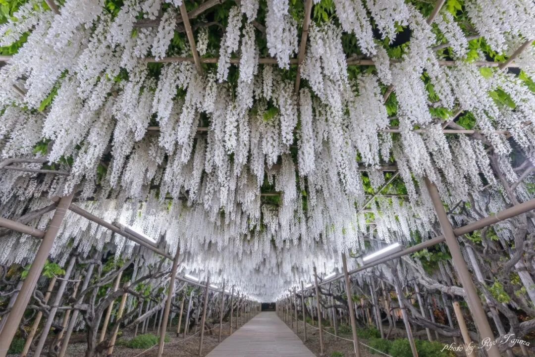 在过去的几年里,摄影师Ryo Tajima访问了该公园,以及全国各地的其他地点,以拍摄这些紫藤花的盛开。他的照片捕捉到了藤蔓的惊人规模,展示了其广度和密度,似乎要爆发出色彩来。
