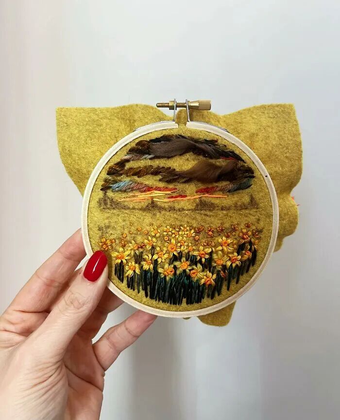 大量的练习,让这位非科班的刺绣爱好者,成长为一名小有名气的纺织艺术家,她独创了色调印象刺绣法,用丰富、浓郁的色彩,来呈现壮美景象。杰莎·斯宾塞使用粗细不一的羊毛来进行创作,田野、丛林、花海、晴空、晚霞、云朵......